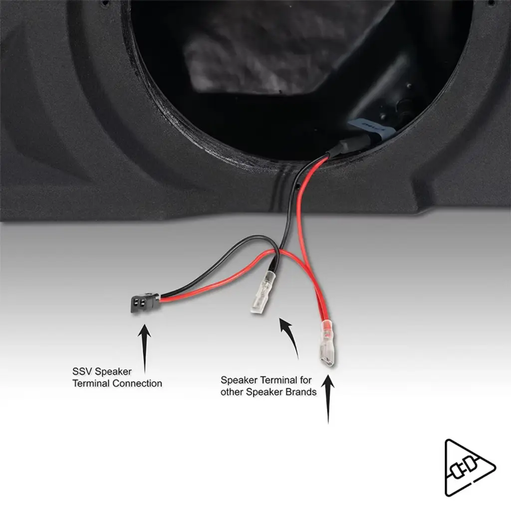 The SSV Works custom molded speaker-pods are designed to clamp into the frame away from your legs. They are 100% rotomolded for the best durability, sound quality and bass response. These speaker-pods are made for a standard 8" speakers, but come with an adapter to fit a 6.5" of your choice. *Speakers not included. Integrated RGB Harness for added flexibility. VERSATILITY:These speaker-pods fit a standard 8" speaker, but also include an adapter to fit a 6.5" speaker of your choice ROAD-READY:Built for the road environment, SSV Works’ audio components will withstand all the harsh riding conditions. From sand, dust, water or snow, you can ride your favorite trails without sacrificing premium audio from SSV Works. EASY INSTALLATION:No drilling or modification required! These speaker pods install using factory mounting locations, making the install for your audio-system a breeze! Specs Factory Mounting: Yes UV Resistant: Yes Integrated RGB Harness: Yes Speaker Size: 8in or 6.5in Speaker Mounting Depth: 70mm / 73mm Airspace: 0.162cu ft Included: 8in Speaker Pods 6.5in Speaker Adapter Mounting Hardware