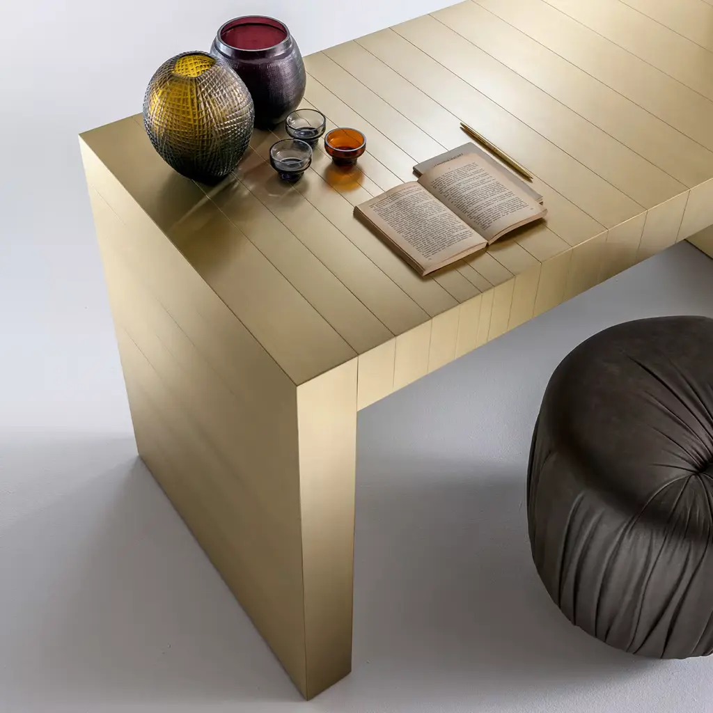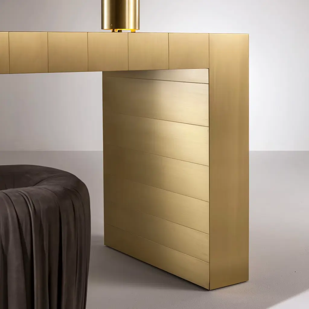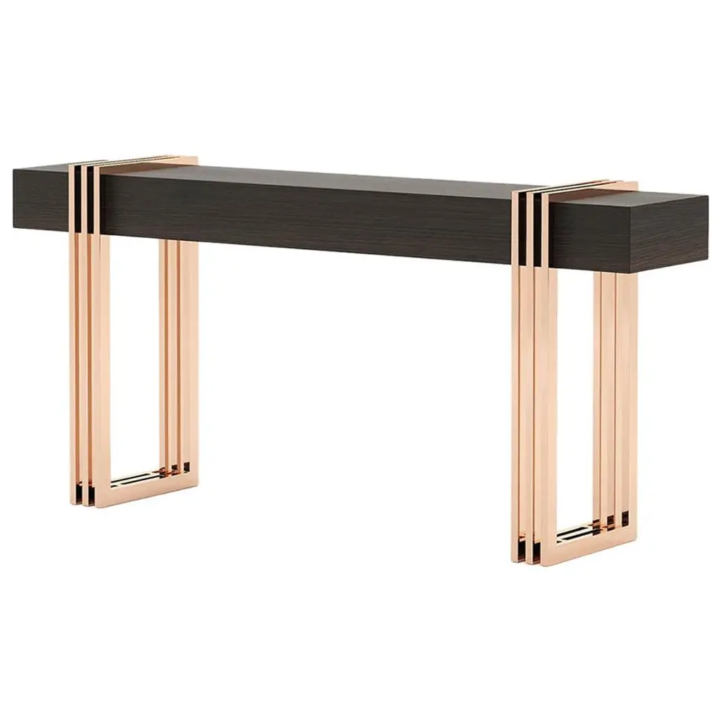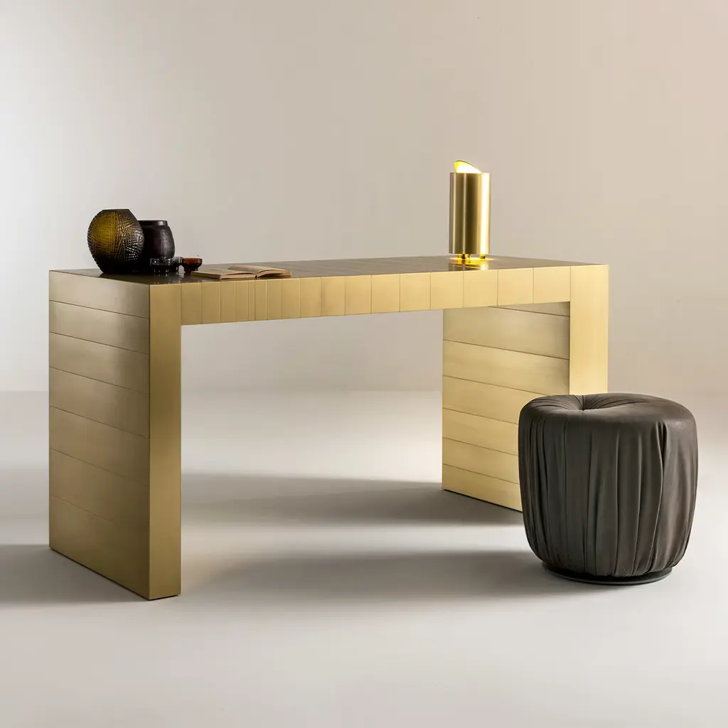 A sublime expression of refined minimalism, this sleek console will make a singular addition to a contemporary-style entryway or living area. Handmade of satin brass, it is also available in polished steel, burnished brass, satin copper, burnished copper, or black iron. Please inquire with the Concierge for further details.
