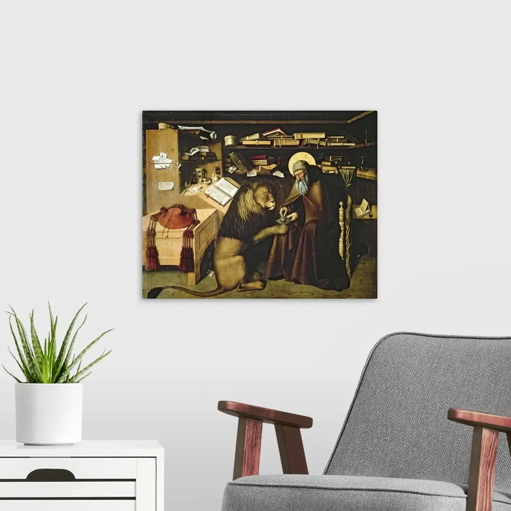 Saint Jerome tirant une epine de la patte du lion; removed thorn and lion remained loyal to him;
