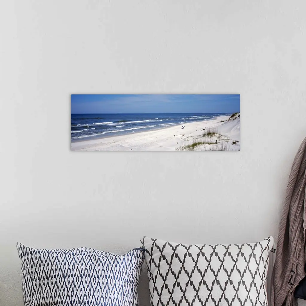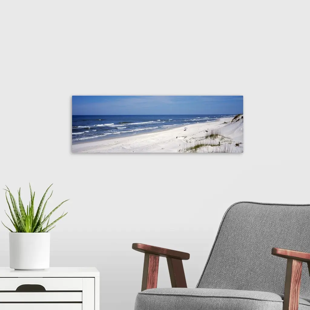 This wall art is a panoramic photograph of a sandy Florida beach lined by dunes on a clear sunny day with waves washing up on the shore.