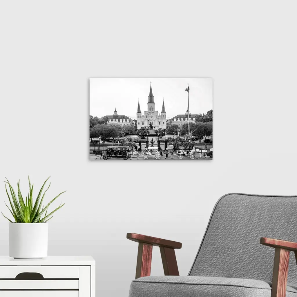 View of carriages stand in front of St. Louis Cathedral and Jackson Square in New Orleans, Louisiana.