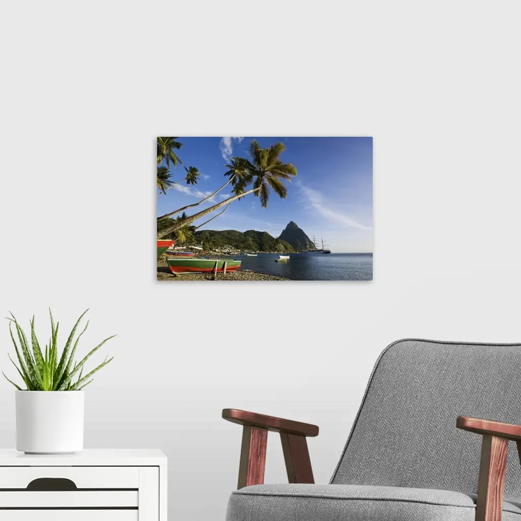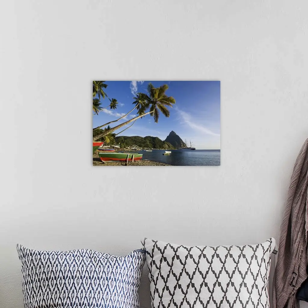 St Lucia, Soufriere, Fishing boats in Soufriere Bay with Petit Piton in the background wall art for home and office decor. Discover canvas art prints, photos, mural, big canvas art and framed wall art in GreatBigCanvas.com's varied collections.