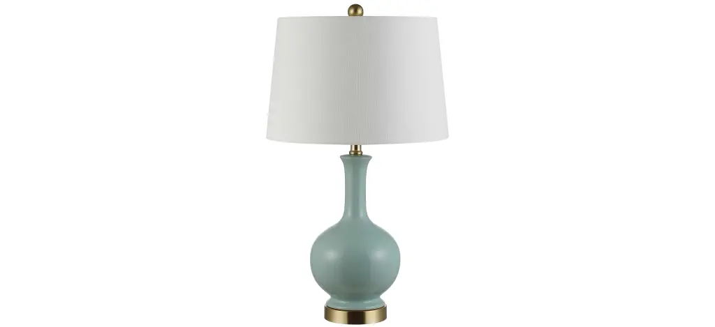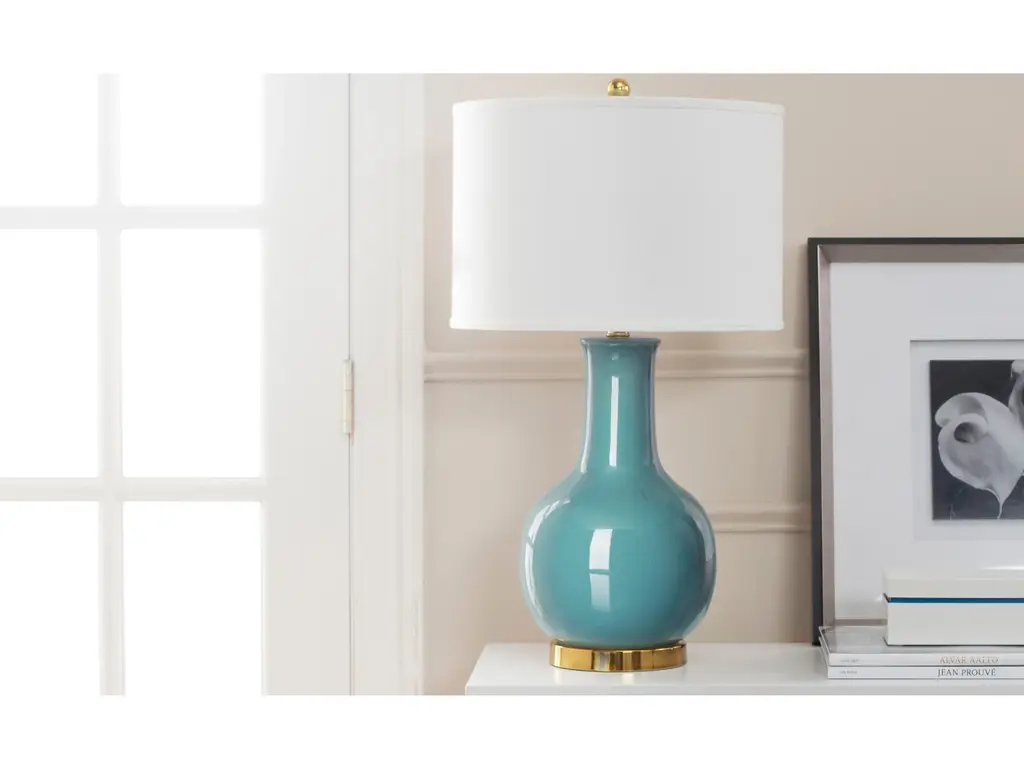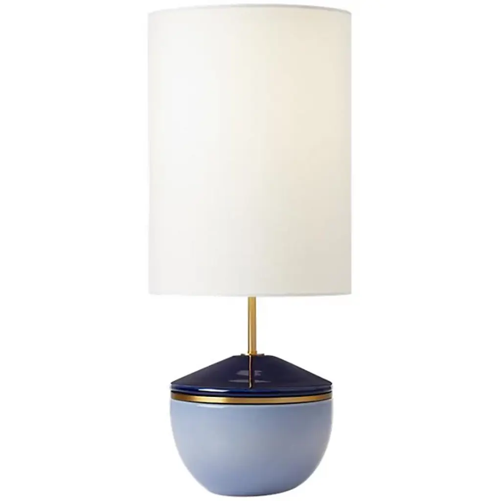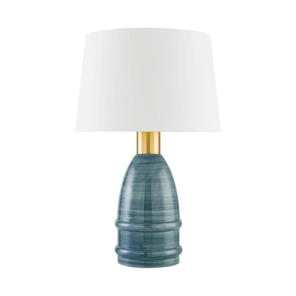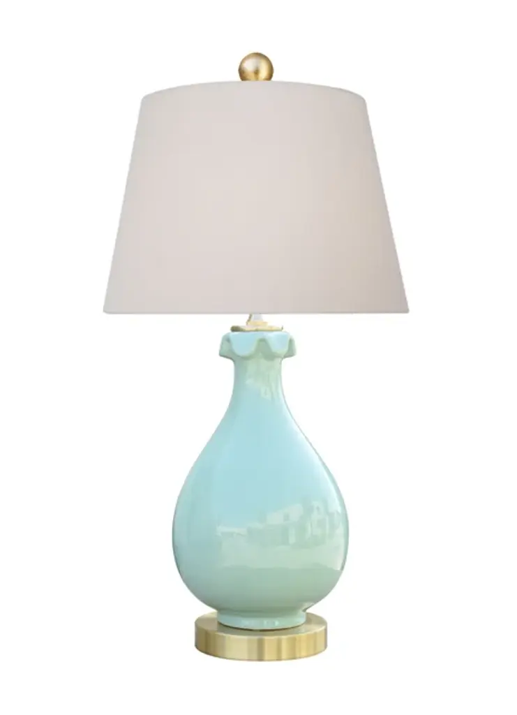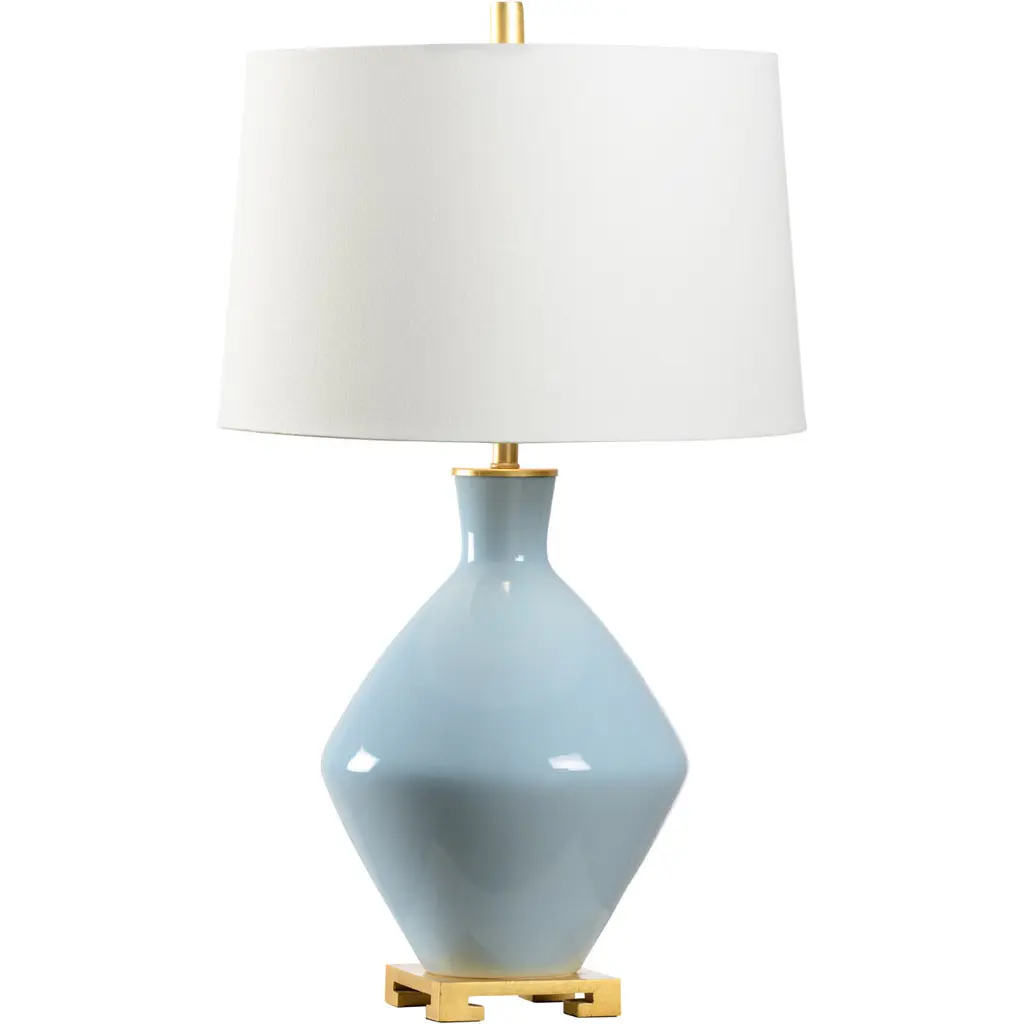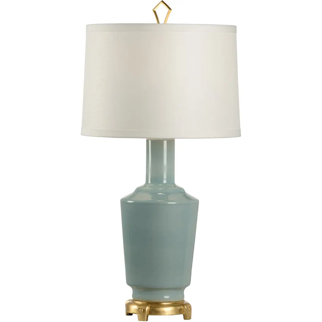 Blue crackle glazed ceramic with antique gold leaf wood cap and base and with antique brass parts. Designed by Jamie Merida.