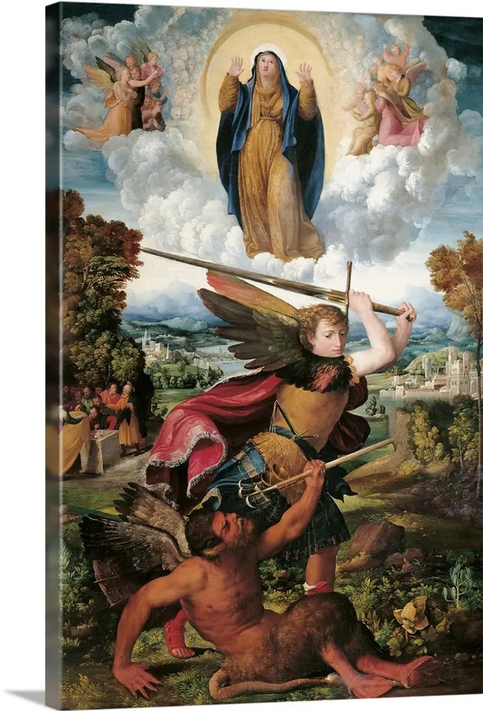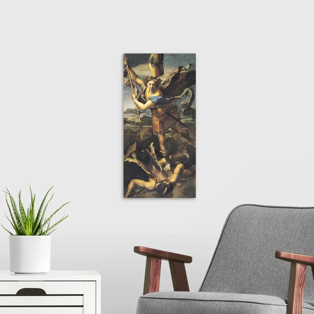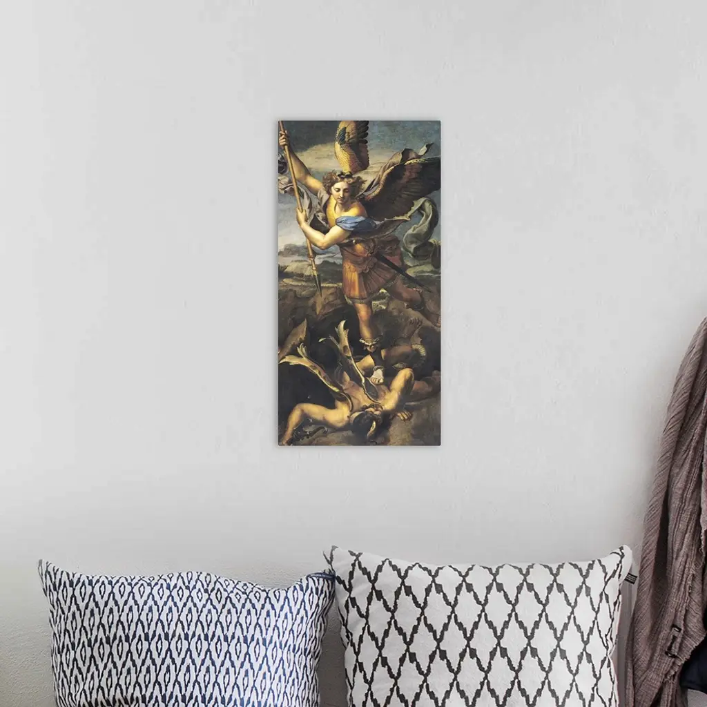 XIR24940 St. Michael Overwhelming the Demon, 1518 (oil on canvas); by Raphael (Raffaello Sanzio of Urbino) (1483-1520); 268x160 cm; Louvre, Paris, France; Giraudon; Italian, out of copyright