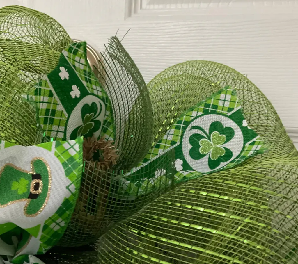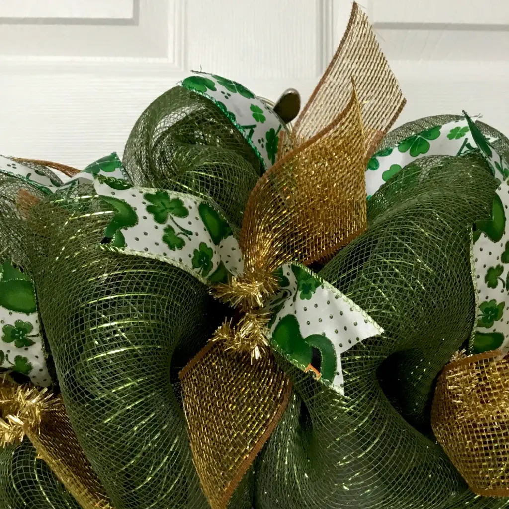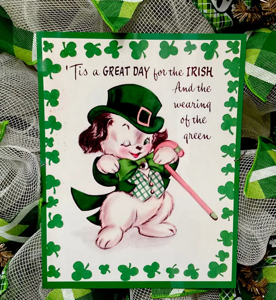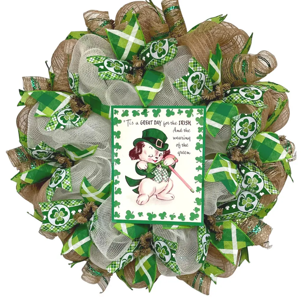 Large, Premium St Patrick''s Day Wreath. A large, UV protected, aluminum sign rests on a bed of creamy beige deco mesh. The sign is decorated with an adorable puppy, dressed in St Patricks Day clothing. The sign says "Its a Great Day for the Irish and the Wearing of the Green. " The inner ring has premium, light green shamrock ribbons and green plaid ribbons. The outer ring is made of natural burlap. Burlap flutes with green metallic stripes and green shamrock ribbons surround the exterior. The size is 24 inch diameter and 6 inches deep.