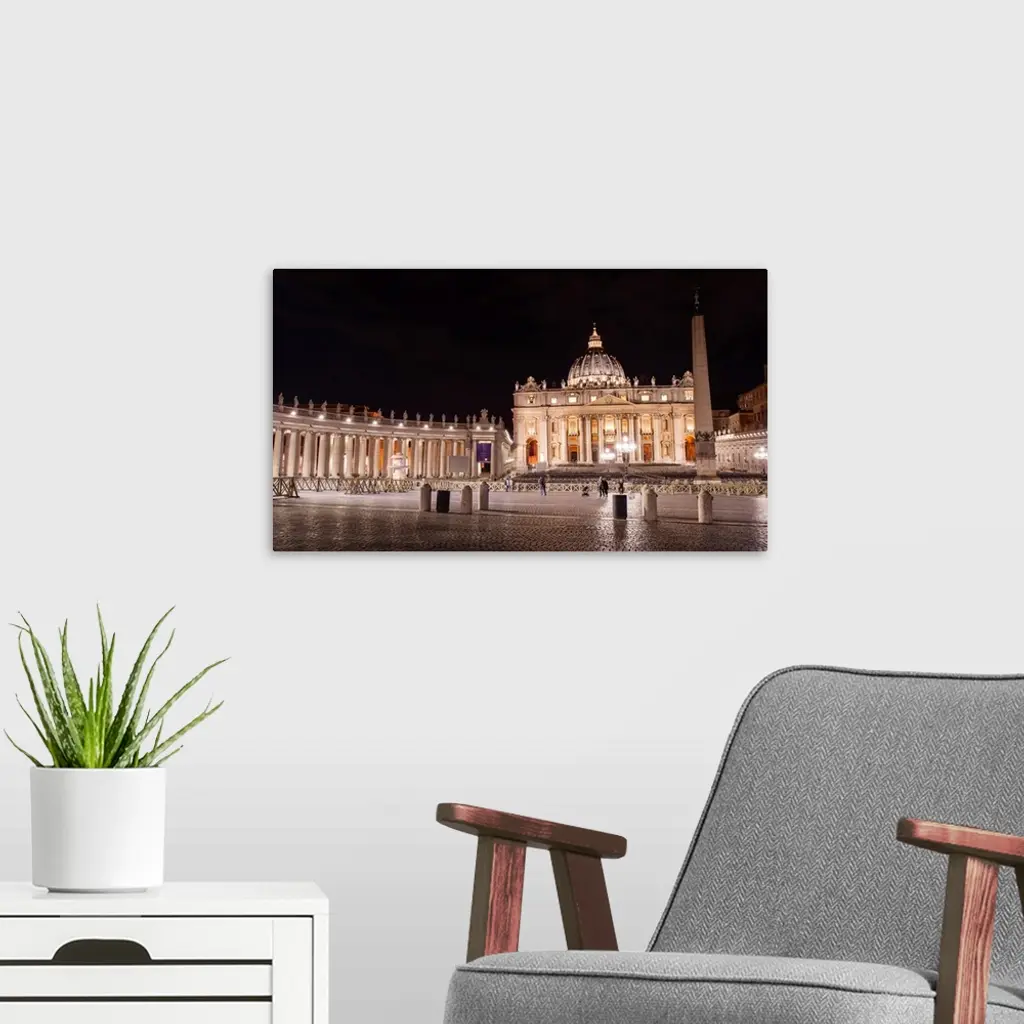 Photograph of St. Peter's Basilica at St. Peter's Square in Vatican City at night.