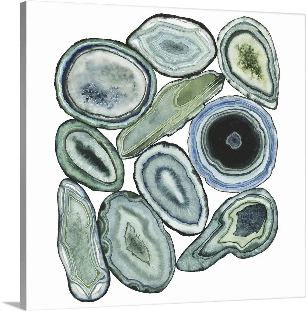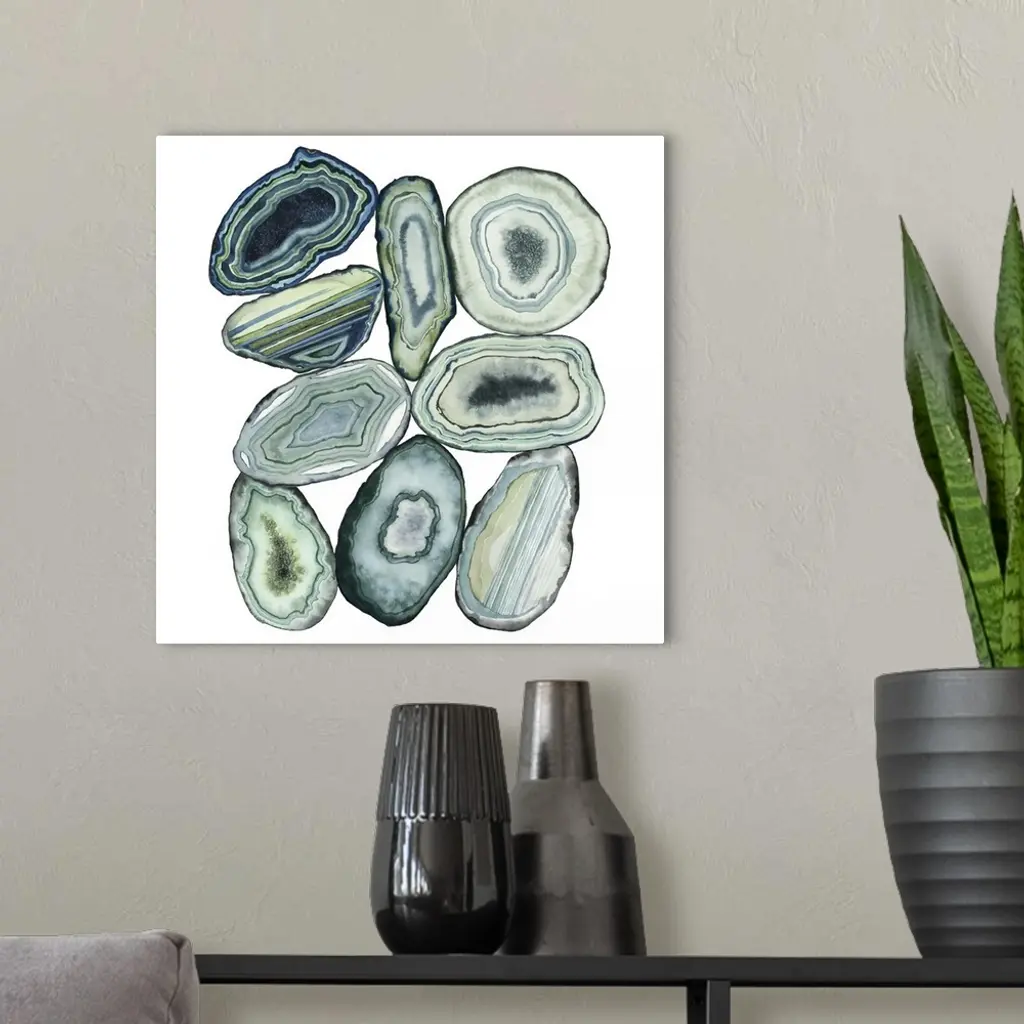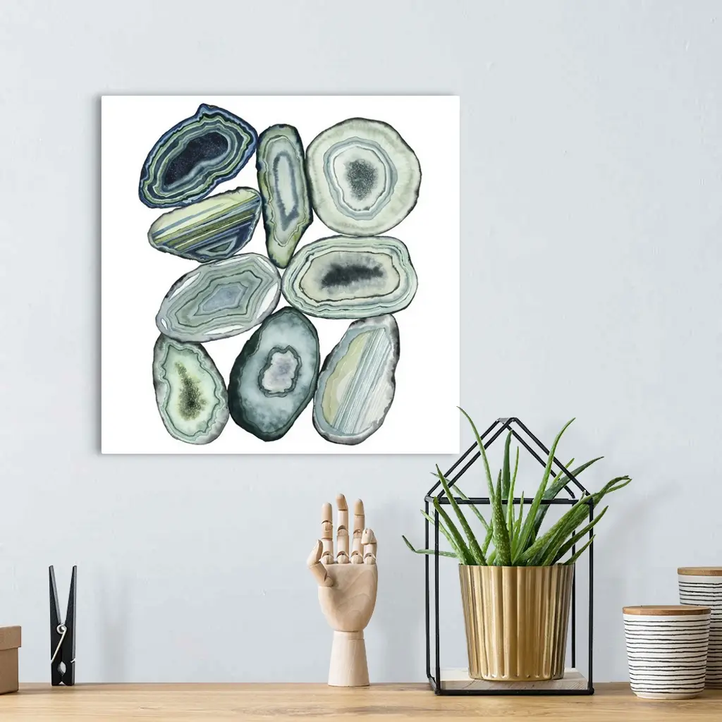 In this decorative square art, slices of agate are stacked near each other showing the intricate patterns in shades of blue.