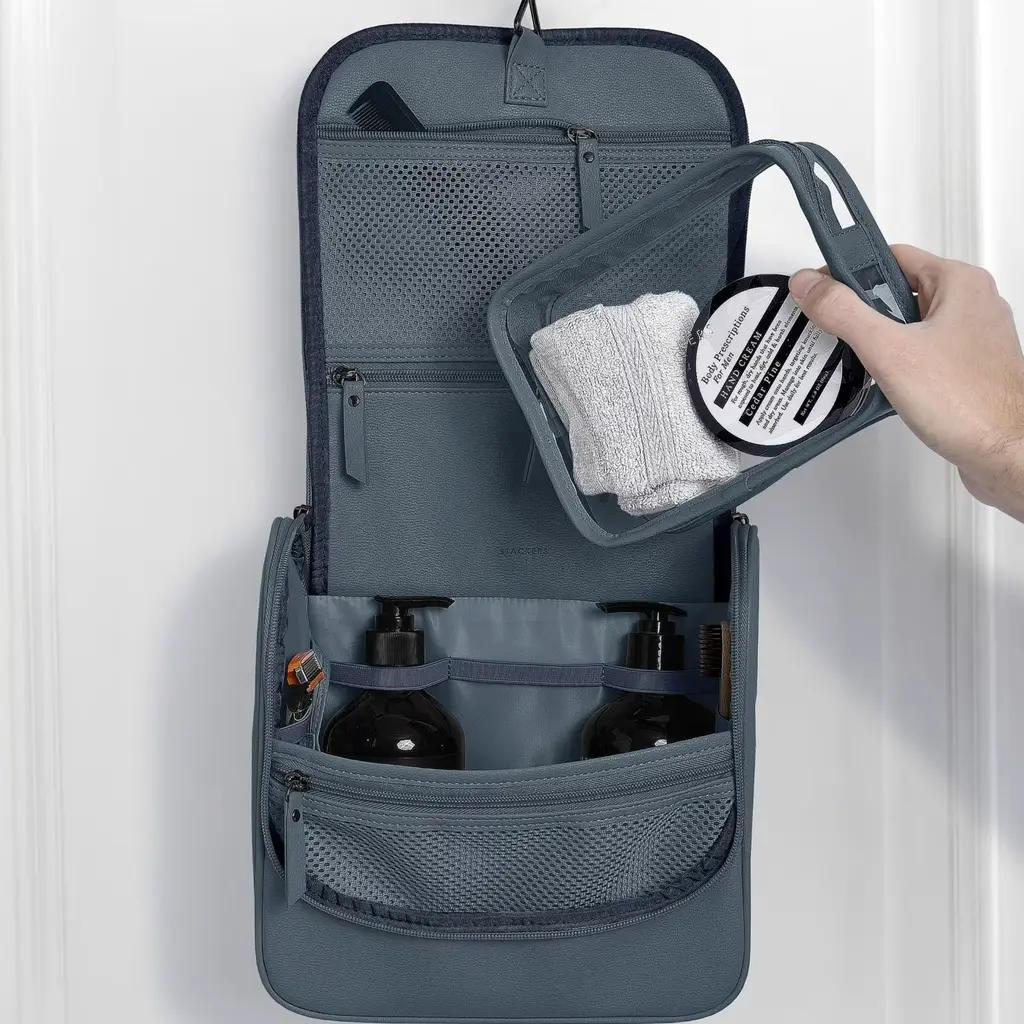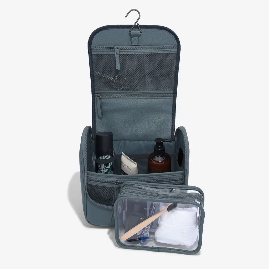 Perfect for frequent travellers, whether it's a weekend getaway or a week in the sun.The Stackers Hanging Wash Bag features a faux leather exterior, elasticated internal pockets and multiple zipped compartments.Large enough to hold full size shampoos and conditioners and finished with a hanging hook for easy access. It also comes with a clear removable pouch for airport security and long haul on-board essentials, you won't want to travel without this.