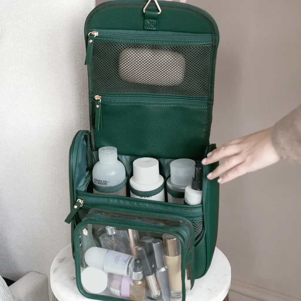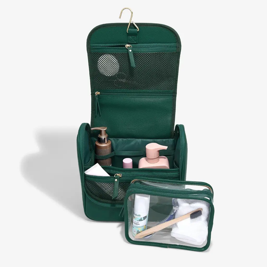Perfect for frequent travellers, whether it's a weekend getaway or a week in the sun.The Stackers Hanging Wash Bag features a faux leather exterior, elasticated internal pockets and multiple zipped compartments.Large enough to hold full size shampoos and conditioners and finished with a hanging hook for easy access. It also comes with a clear removable pouch for airport security and long haul on-board essentials, you won't want to travel without this.