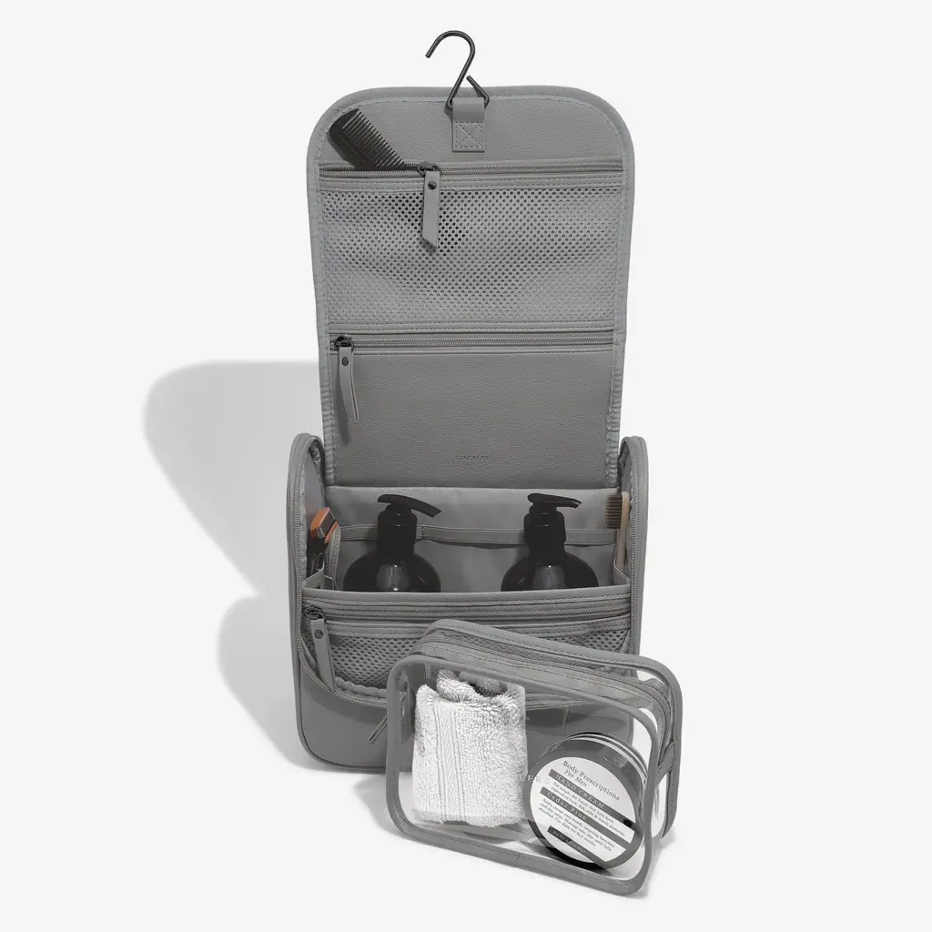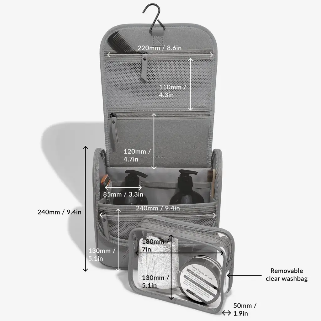 Perfect for frequent travellers, whether it's a weekend getaway or a week in the sun.The Stackers Hanging Wash Bag features a faux leather exterior, elasticated internal pockets and multiple zipped compartments.Large enough to hold full size shampoos and conditioners and finished with a hanging hook for easy access. It also comes with a clear removable pouch for airport security and long haul on-board essentials, you won't want to travel without this.