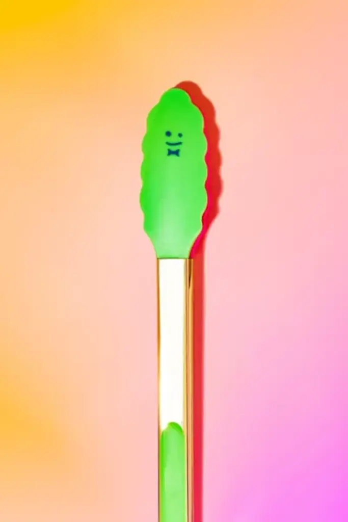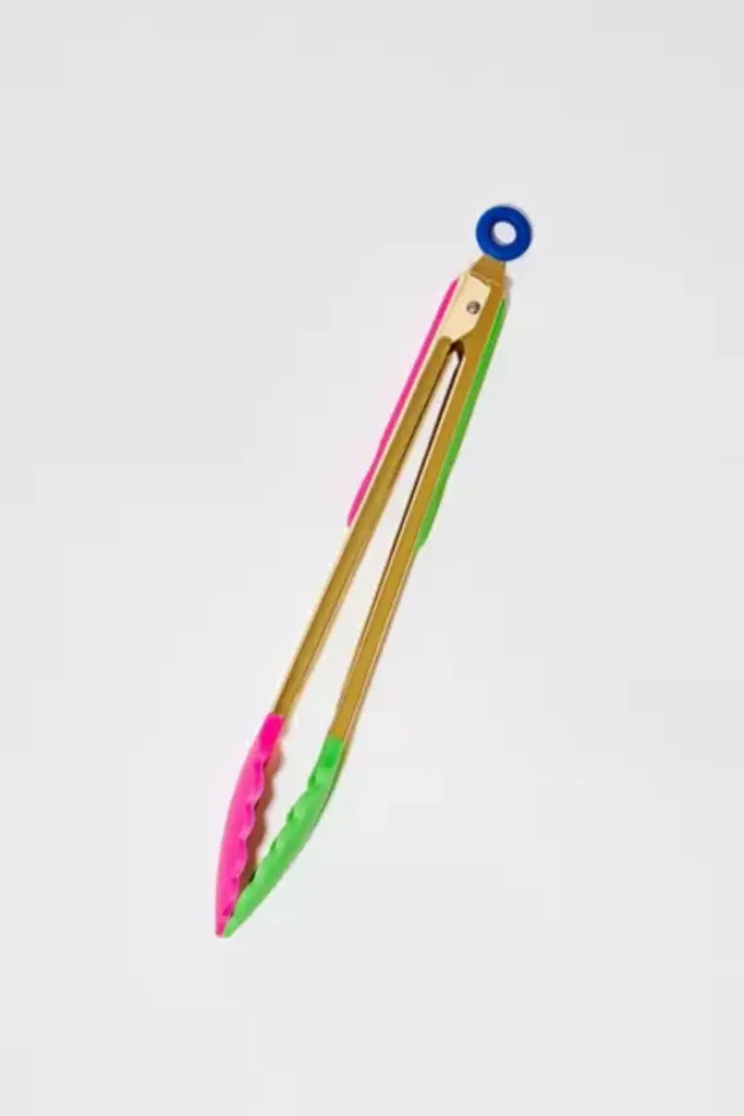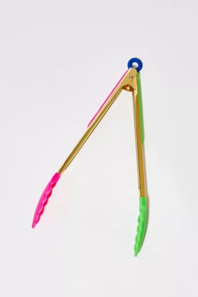 Brighten your kitchen with these sturdy multi-color tongs. One side has pink silicone grips, the other side has green silicone grips. Both sides have a golden stainless steel core and smiley faces eager to lend you a hand. The push-pull ring locking mechanism is the blue cherry on top (or is it bottom)? **Features:** \- 12-inch Kitchen Tongs \- Quick Push-and-Pull Lock \-Silicone and Stainless Steel \- Compatible with all your cookware, including nonstick. \- FDA Food Safe \- Dishwasher Safe **Content + Care** \- Materials: Silicone and stainless steel \- Care: Dishwasher safe \- Made in China **Size + Fit** \- 12" in length