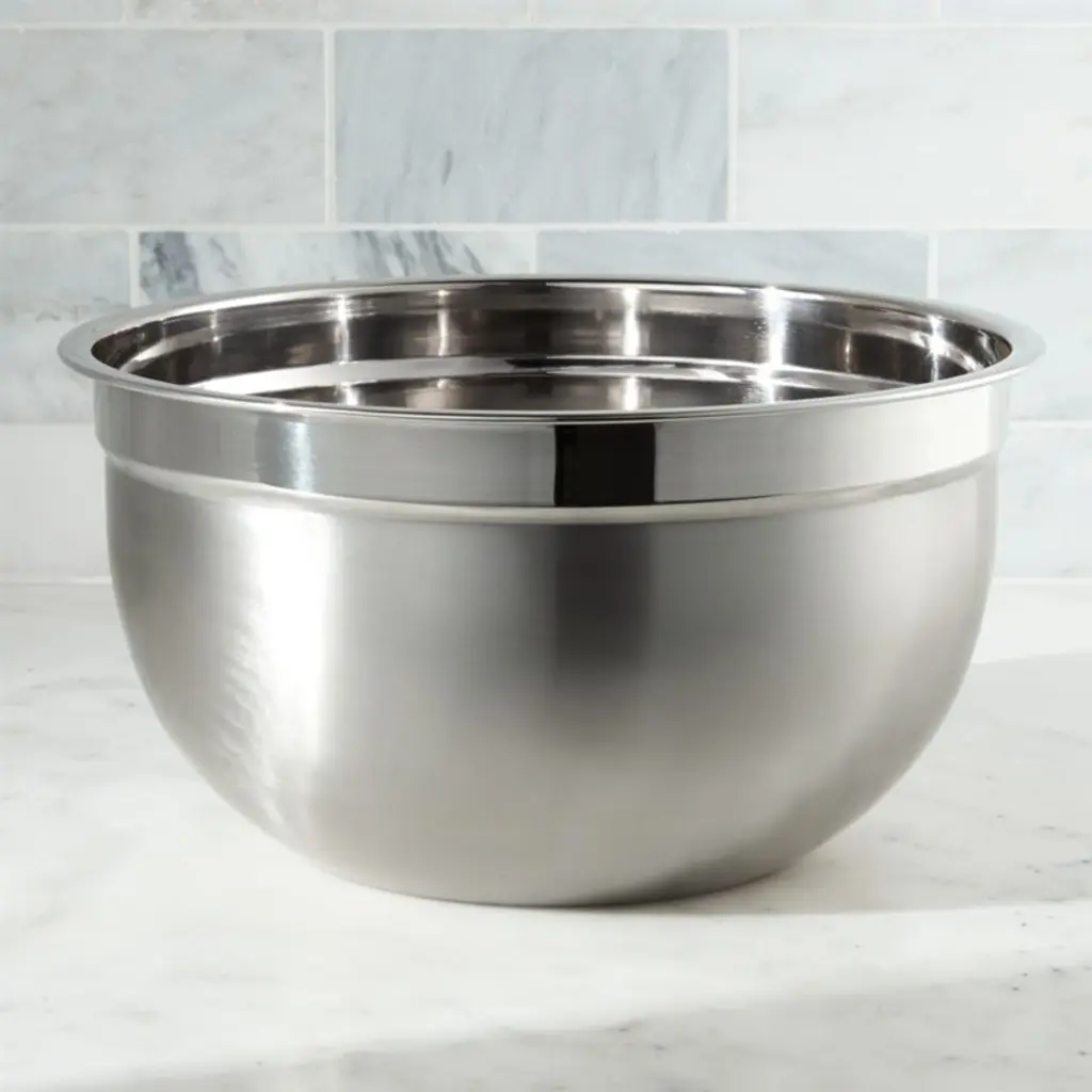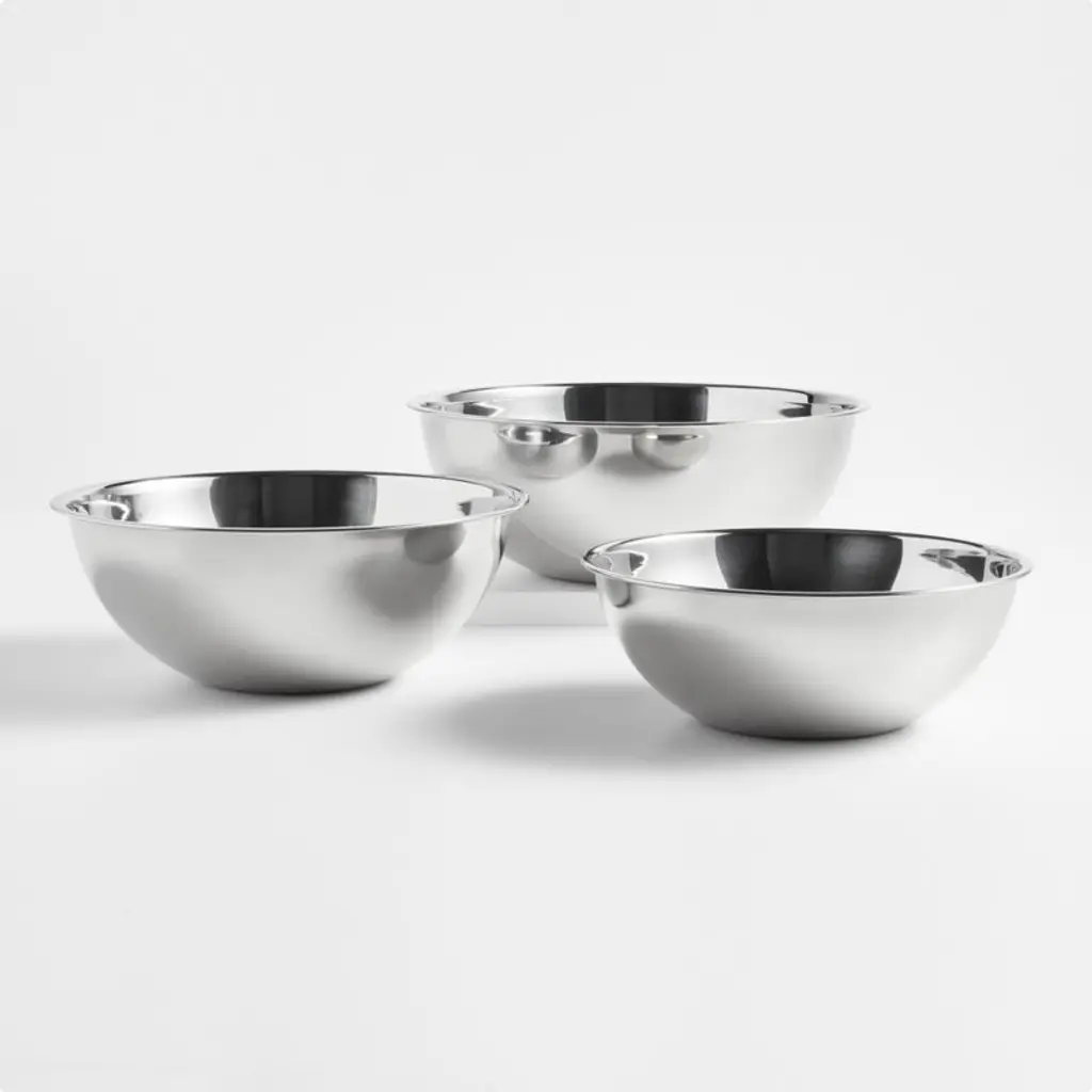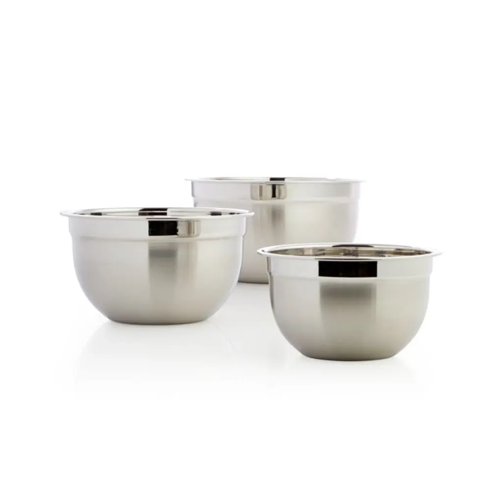 Timeless, all-purpose kitchen workhorses in durable stainless feature a dual finish contrasting matte exteriors with polished interiors. These three bowls feature flat bases to provide balance and stability, while articulated rims provide a sturdy grip. Nesting for compact storage, the large bowls offer versatile utility for prepping, mixing and serving then clean up easily in the dishwasher. Our exclusive set includes 3-, 5- and 7-quart stainless steel bowls.