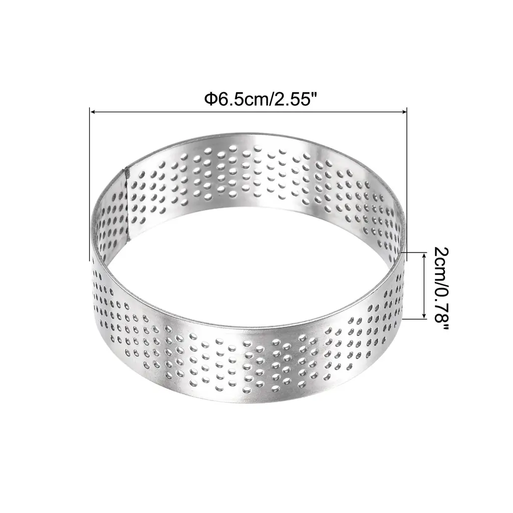 Why Choose Small Cake Rings?These round cake rings are made of stainless steel, high temperature, corrosion-resistant and rust resistant, not easy to deform, lasting for long term use.These cake rings can withstand temperatures between -30 °C and 150 °C for extended periods. Easy for cleaning, microwave and dishwasher safe. The round cake rings are designed with double-rolled edges, and the surface is smooth, which can protect fingers and use safely.Non-stick coating can reduce the use of edible oil and cooking time, reduce energy consumption, and is easier to release.The cake ring has a venting hole design and the venting holes are evenly distributed and ventilated without leaking.Perforated cake mousse ring set is suitable for creating cakes, mousse and desserts.Suitable for daily cooking, family dinner, friend gatherings, holidays, etc.Specification:Material: Stainless steelColour: SilverShape: CircularSize: 6.5 cm x 2 cm/2.55" x 0.78" (D*H)Package Included: 1pcs x Cake Ring