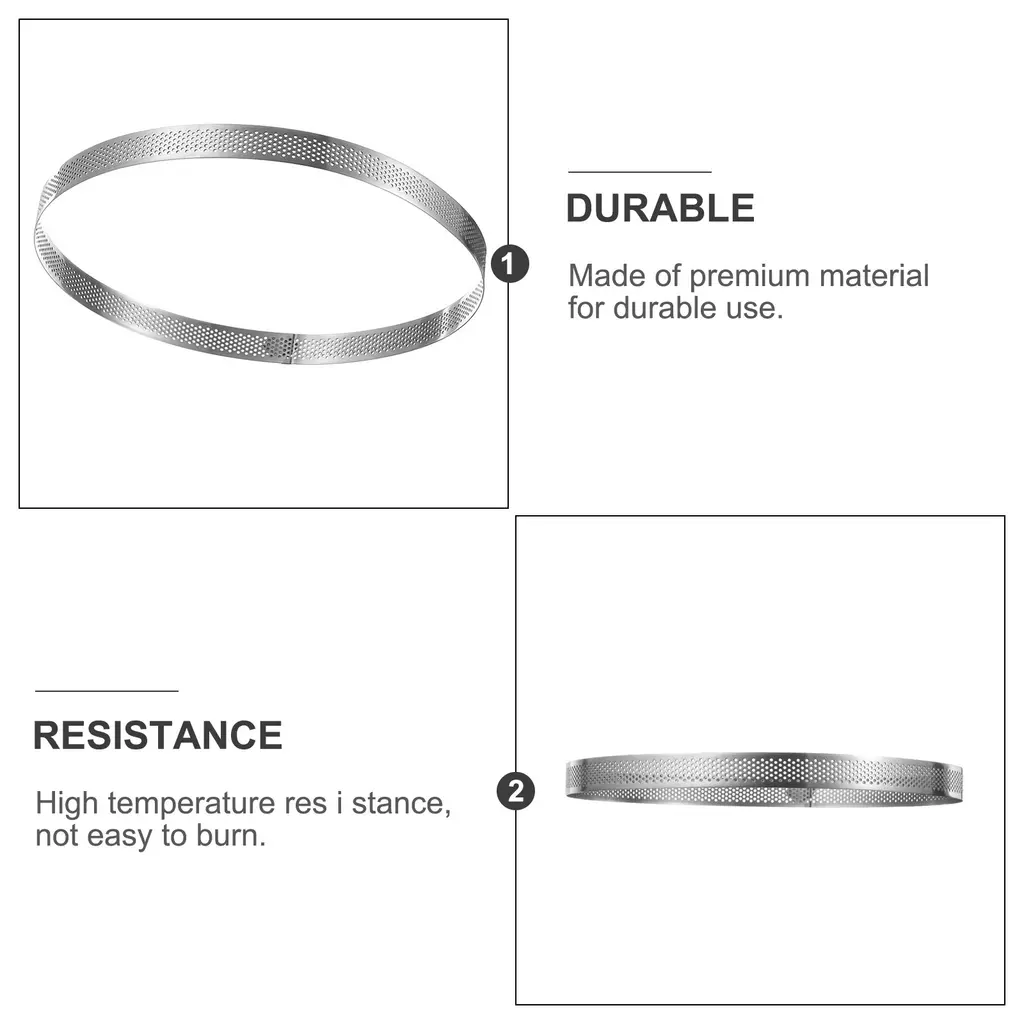 Why Choose Small Cake Rings?These round cake rings are made of stainless steel, corrosion-resistant and rust resistant, not easy to deform, lasting for long term use.These cake rings can withstand temperatures between -30 °C and 150 °C for extended periods. Easy for cleaning, microwave and dishwasher safe. The round cake rings are designed with double-rolled edges, and the surface is smooth, which can protect fingers and use safely.Non-stick coating can reduce the use of edible oil and cooking time, reduce energy consumption, and is easier to release.The cake ring has a venting hole design and the venting holes are evenly distributed and ventilated without leaking.Perforated cake mousse ring set is suitable for creating cakes, mousse and desserts.Suitable for daily cooking, family dinner, friend gatherings, holidays, etc.Specification:Material: Stainless steelColour: SilverShape: CircularSize: 24.8 cm x 2 cm/9.75" x 0.78" (D*H)Package Included: 1pcs x Cake Ring