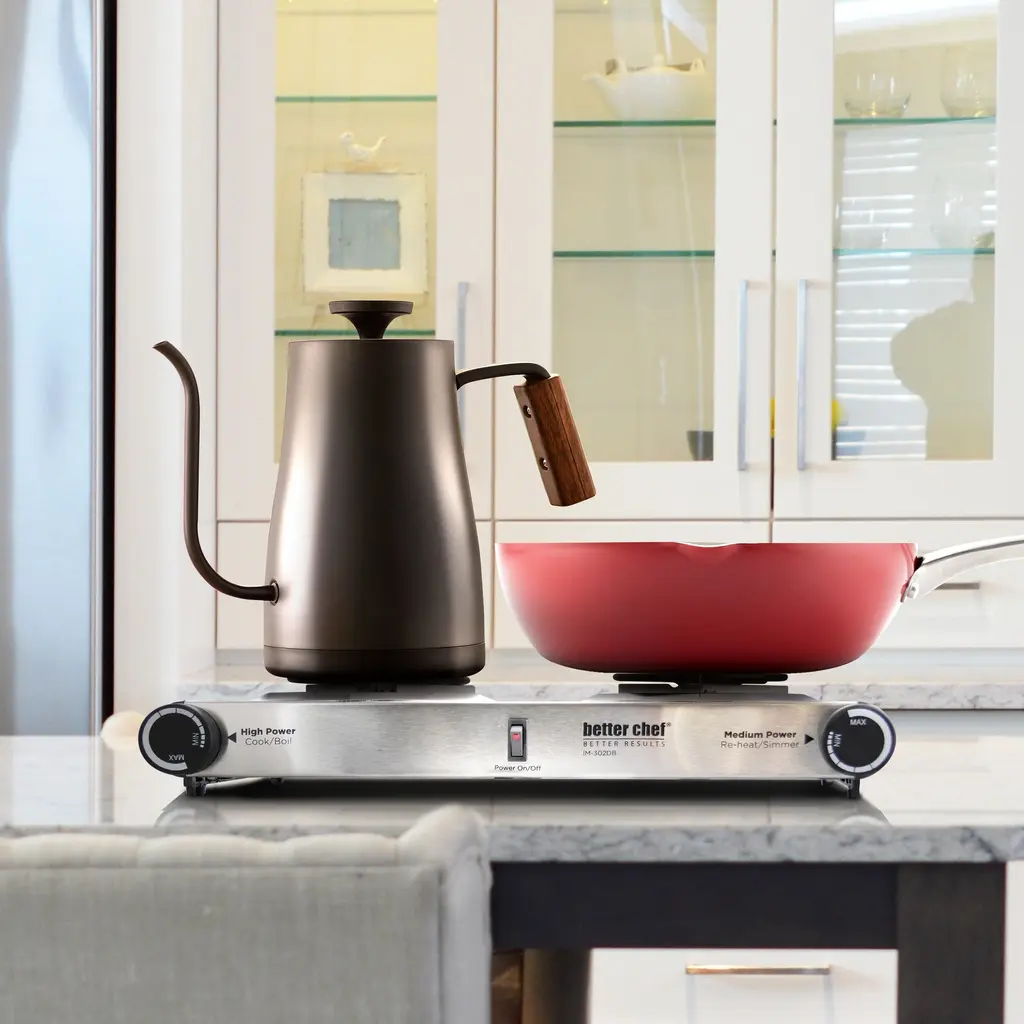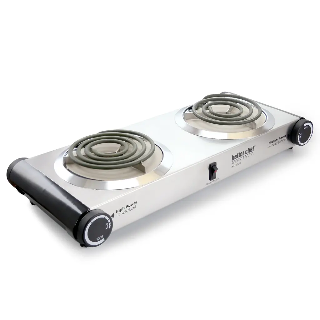 Ever need an extra burner during holiday cooking? Having company and need to keep something warm? Do crafts and not want to mess up your kitchen? The Better Chef Stainless Steel Dual Electric Burner is just the ticket! This dual burner features an adjustable temperature thermostat control to ensure you cook your next great meal at just the right temperature. The beautiful brushed stainless-steel finish will add a sleek look to your countertops. Dual self-cleaning coiled heating plate Safety on/off switch Indicator light 1500 Watts Total Removable elements for easy cleaning Measures 3.75 in. H x 9 in. W x 21 in. LItem Weight: 4.25lbs Item Dimensions: 21.00" x 9.00" x 3.00"Item Weight: 4.25lbs