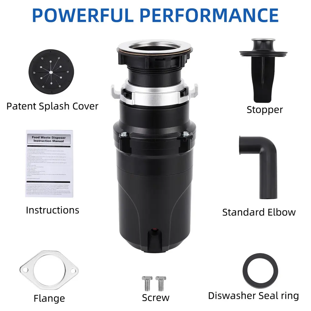 Convenient Continuous Feed Feature: The 1/2 hp, 1 hp, 3/4 hp garbage disposal allows for continuous feeding, enabling users to add food waste while the unit operates. This efficiency reduces the likelihood of clogs and makes it easier to manage kitchen waste in real-time. Powerful Grinding System: Featuring a 3-stage, 4-stage grinding system and a robust 3500 RPM DC motor, this garbage disposal can tackle tough food waste, including bones and fruit cores. The durable stainless steel grinding components provide consistent and reliable performance for various kitchen scraps. Whisper-Quiet Operation: Designed with a 5-layer soundproofing system, this under-sink disposal minimizes noise and vibration during operation. The combination of a splash guard, soundproofing cotton, and thick ABS housing creates a quieter kitchen environment, allowing for peaceful cooking and dining experiences. Enhanced User Safety: Safety features such as overload protection and a reset button ensure safe operation of the garbage disposal. These mechanisms protect both the user and the device from potential damage, providing peace of mind during use. Hassle-Free Installation: This kitchen sink garbage disposal is designed for easy installation or replacement, fitting most common mounting components. With all necessary hardware included, such as the power cord and sealing rings, setting up the unit is straightforward and convenient, allowing users to enjoy its benefits right away.