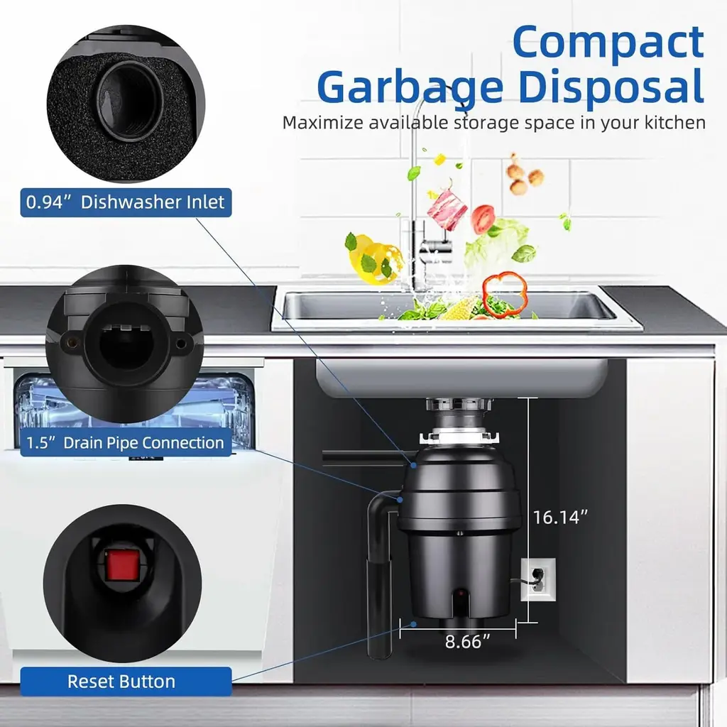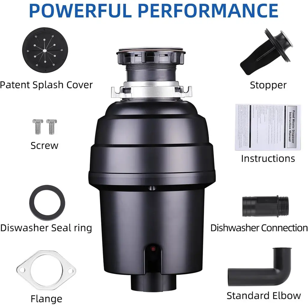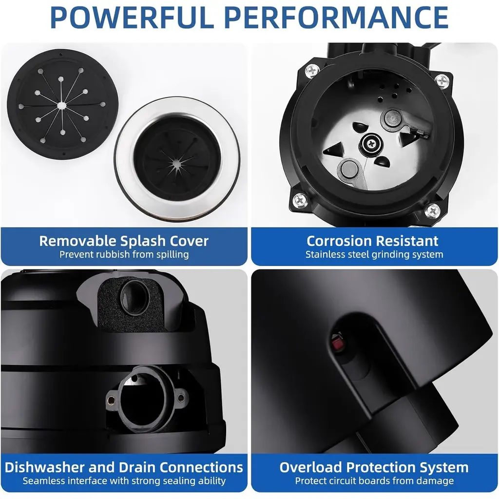 Convenient Continuous Feed Feature: The 1/2 hp, 1 hp, 3/4 hp garbage disposal allows for continuous feeding, enabling users to add food waste while the unit operates. This efficiency reduces the likelihood of clogs and makes it easier to manage kitchen waste in real-time. Powerful Grinding System: Featuring a 3-stage, 4-stage grinding system and a robust 3500 RPM DC motor, this garbage disposal can tackle tough food waste, including bones and fruit cores. The durable stainless steel grinding components provide consistent and reliable performance for various kitchen scraps. Whisper-Quiet Operation: Designed with a 5-layer soundproofing system, this under-sink disposal minimizes noise and vibration during operation. The combination of a splash guard, soundproofing cotton, and thick ABS housing creates a quieter kitchen environment, allowing for peaceful cooking and dining experiences. Enhanced User Safety: Safety features such as overload protection and a reset button ensure safe operation of the garbage disposal. These mechanisms protect both the user and the device from potential damage, providing peace of mind during use. Hassle-Free Installation: This kitchen sink garbage disposal is designed for easy installation or replacement, fitting most common mounting components. With all necessary hardware included, such as the power cord and sealing rings, setting up the unit is straightforward and convenient, allowing users to enjoy its benefits right away.