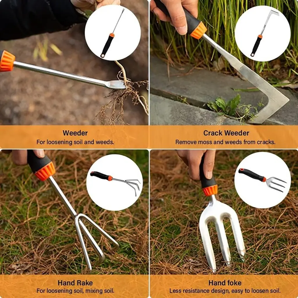 10pcs Premium Gardening Tools: Our gardening tools can meet most gardening needs. The garden tool set have saw, snips, trowels, weeder, rake and fork which are use for loosening soil, weeding, cutting trees and branches, digging and tranplanting. Durable: The gardening tools makes with thick stainless steel, sharp, stronger and harder to bend or break. Humanized Design: Ergonomically design gardening tools have soft handle, non-slip, comfortable, not easy to fatigue to use the tools with or without gloves. Anti-Rust & Easy to Clean: The storage bags can be hand washed and machine washed. There is a hole in the handle of each tool for easy hanging and not easy to rust design. Just wash them with water and hang it up! Portable Storage Bags: Thick textile fabric, fixing elastic loop and multi-pocket design, practical, simple and stylish. There is space left in the bag to hold your other tools, such as spray bottle, plant labels, seeds and ect.