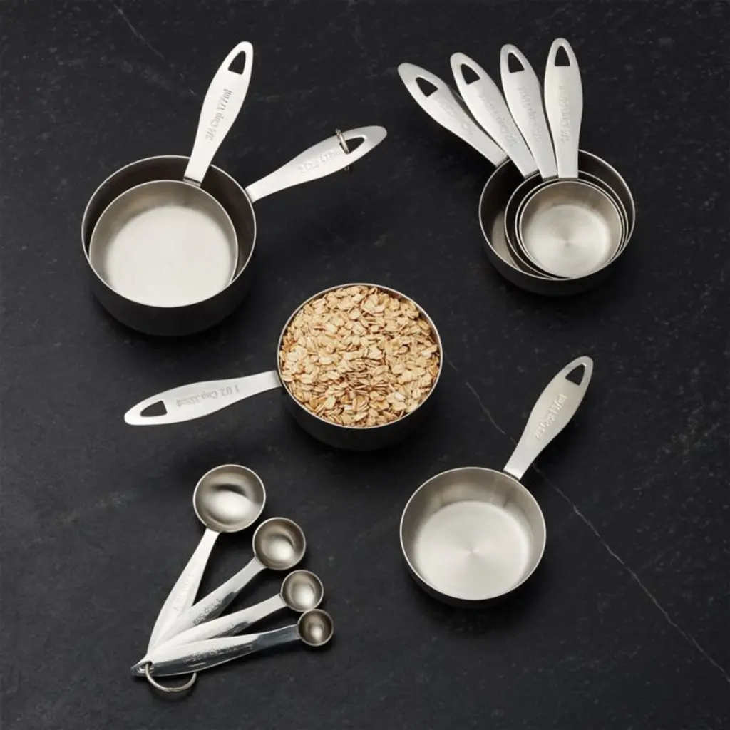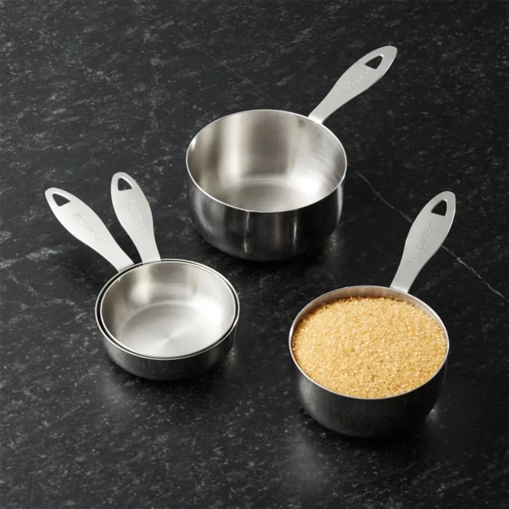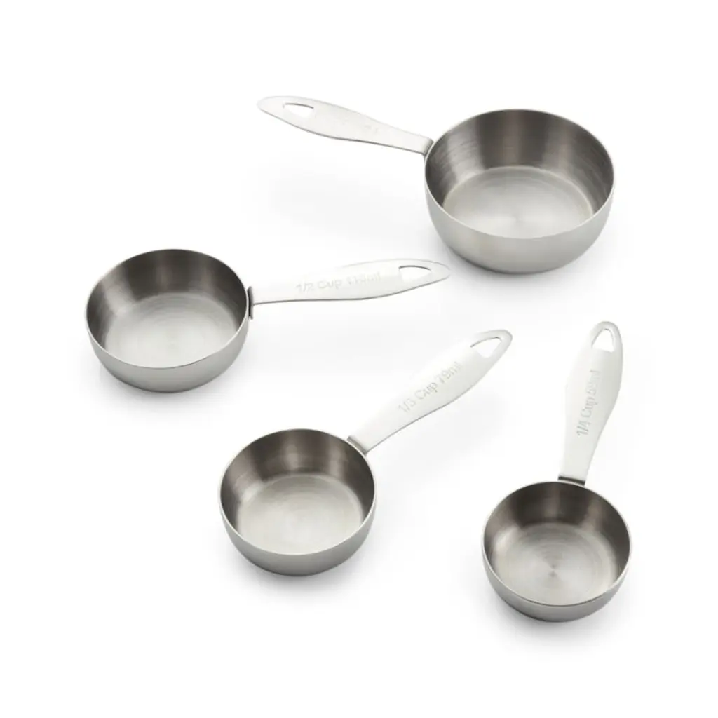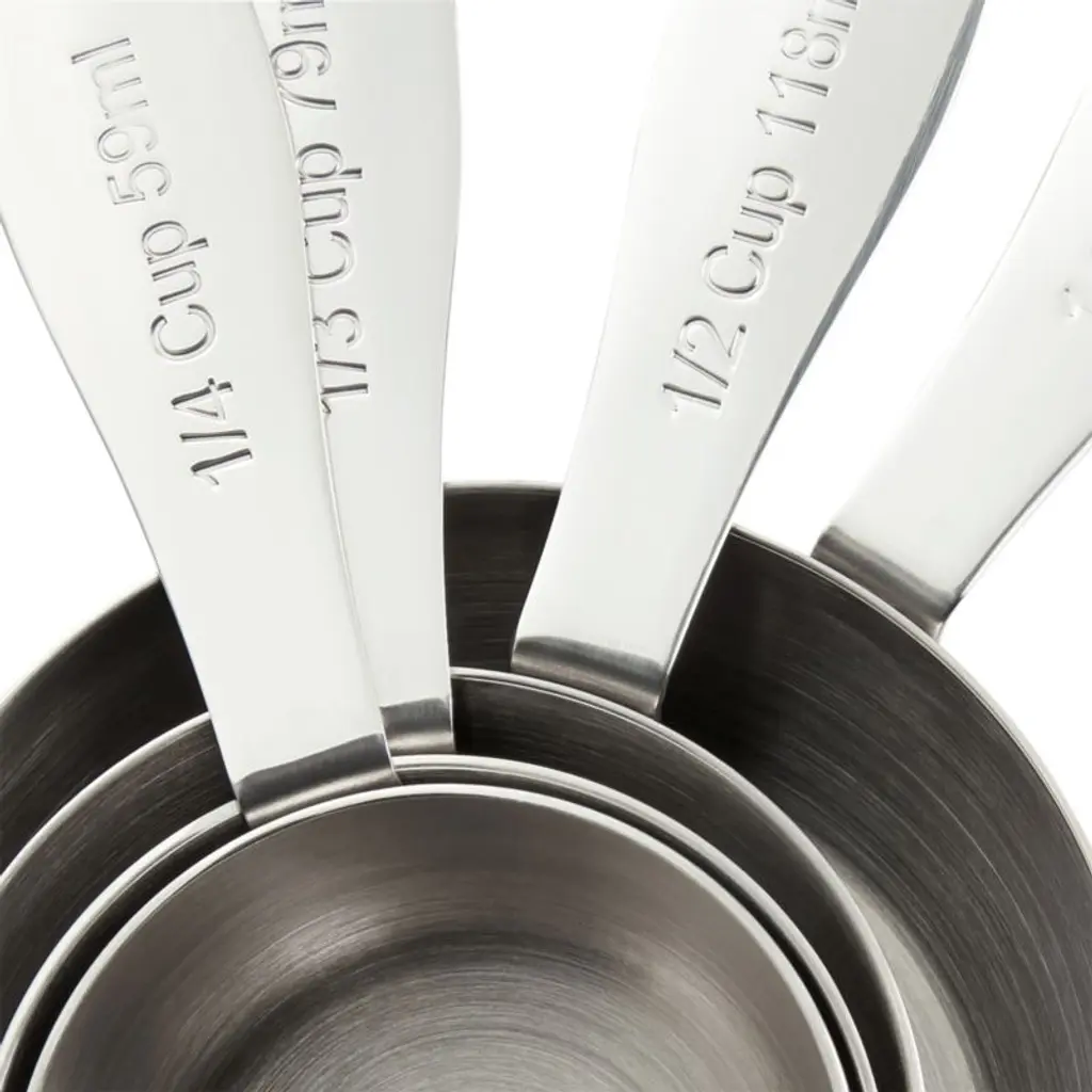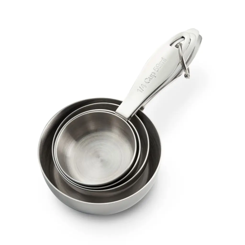 Substantial stainless steel measuring cups feature a uniquely wide, low profile and flat bases that sit steady on the counter. This sturdy dishwasher-safe set includes ¼, ?, ½ and 1 cup nesting measuring cups. Separate the cups, or use the handy included ring to link them together. Imperial and metric measurements are stamped into the handles for easy identification.