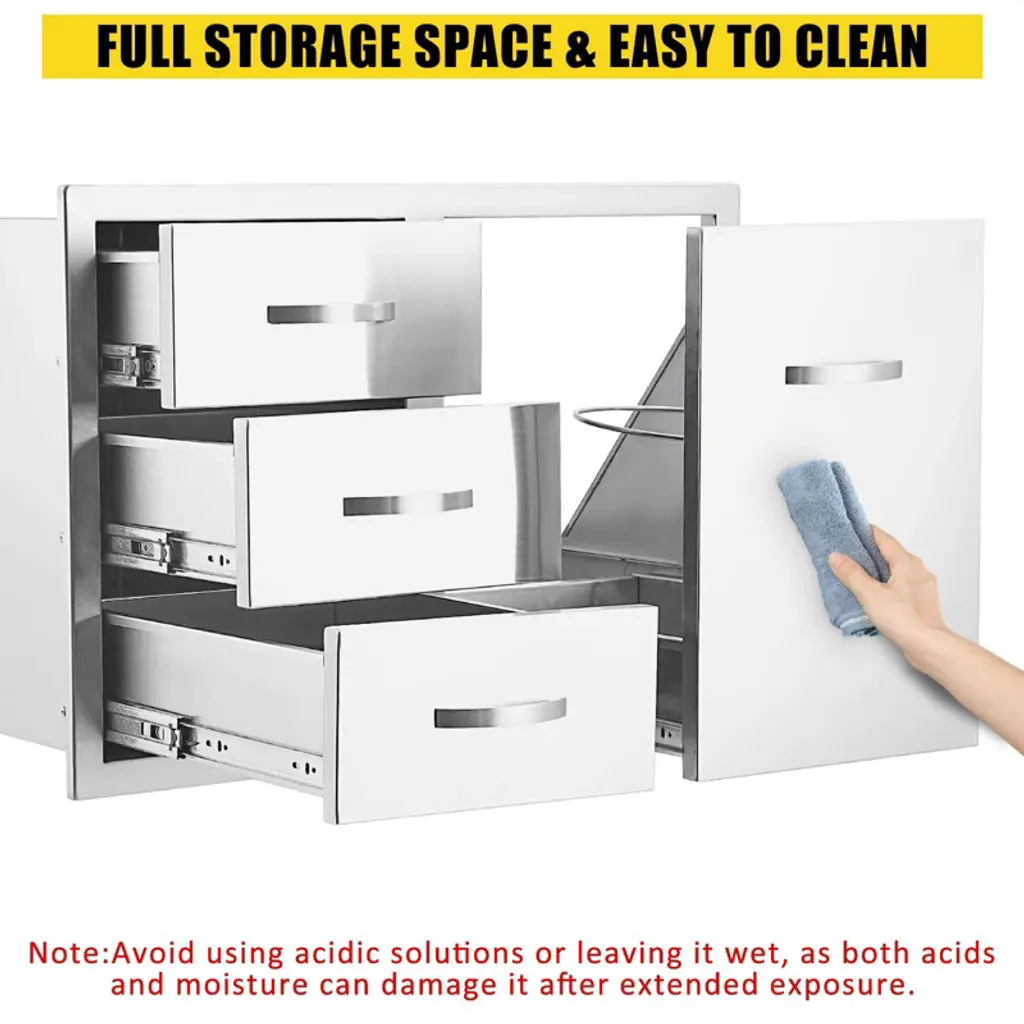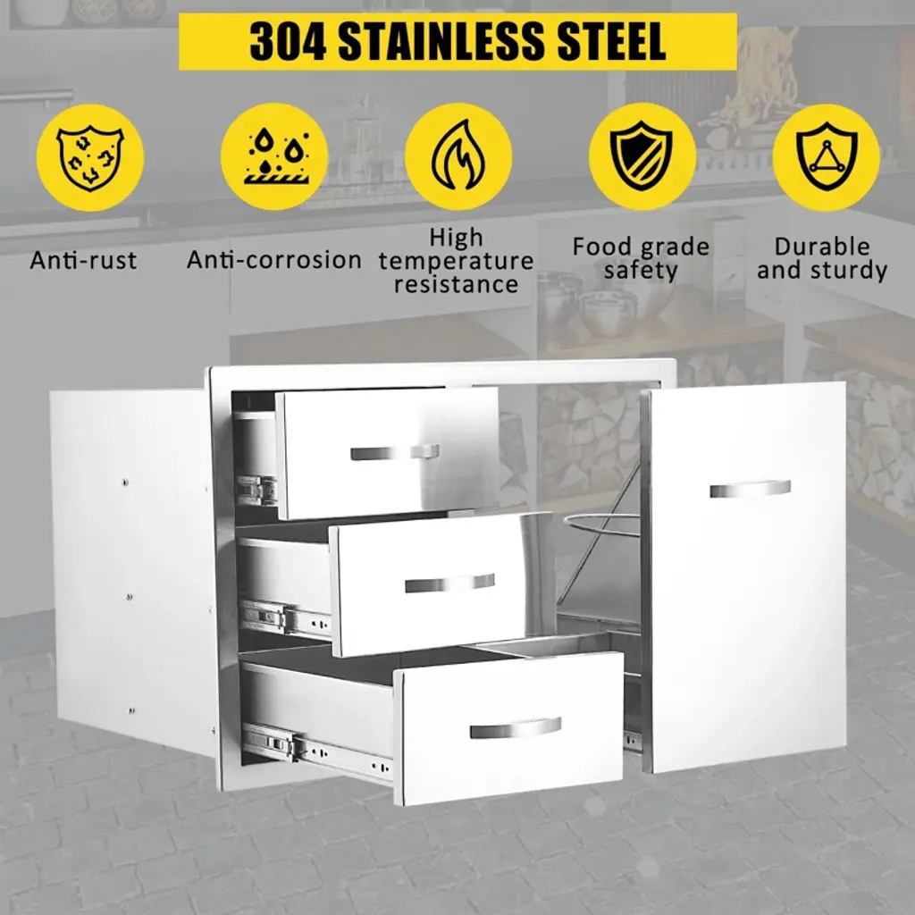 TROPOW Stainless Steel Outdoor Kitchen Cabinet Set ¨C NSF-Certified Left Drawer + Right Door Combo (28" Silver)1?? Commercial-Grade Construction? NSF-certified 304 stainless steel with double-wall reinforcement? 52.6lb heavy-duty frame withstands extreme weather conditions? Brushed fingerprint-resistant finish for easy maintenance2?? Professional Storage Features? Integrated 7-hook system for BBQ tool organization? Magnetic latch closure with weatherproof seal? 20" deep capacity fits standard propane tanks3?? Smart Ventilation Design? Included perforated vent panel prevents moisture buildup? Cross-breeze airflow channels reduce interior condensation? Ideal for grill islands & fire pit surrounds4?? Hassle-Free Installation? Pre-drilled mounting holes for flush cabinet integration? Self-aligning hinges with smooth 90¡ã opening? No drilling required ¨C ready for immediate setup5?? Premium Outdoor Performance? Saltwater/chlorine resistant for coastal/poolside use? -30¡ãF to 500¡ãF temperature rating? Lifetime rustproof warranty?? Technical Specifications? Dimensions: 28"W ¡Á 20"H ¡Á 20"D? Material: 1.2mm 304 Stainless Steel? Door Swing: Right-handed (reversible)? Weight Capacity: 75lbs per shelf??? Package Includes? Left drawer + right door combo? Ventilation panel (12"¡Á20")? Mounting hardware kit?? Professional Tips:¡ú Pair with outdoor-rated drawer slides¡ú Apply food-grade silicone for waterproofing¡ú Ideal for built-in kamado grills?? Industrial Features? UL-rated fire resistance? Marine-grade corrosion protection? ADA-compliant handle design? 10-year structural guarantee