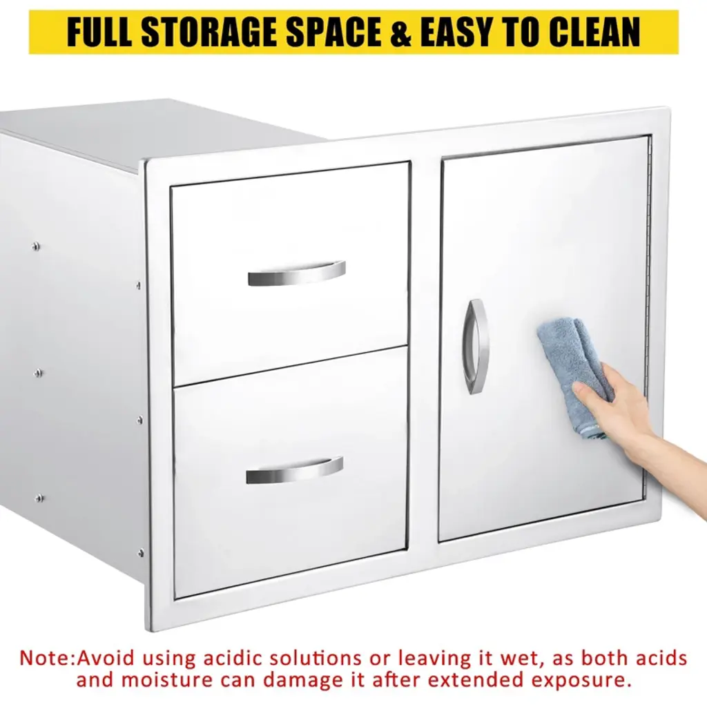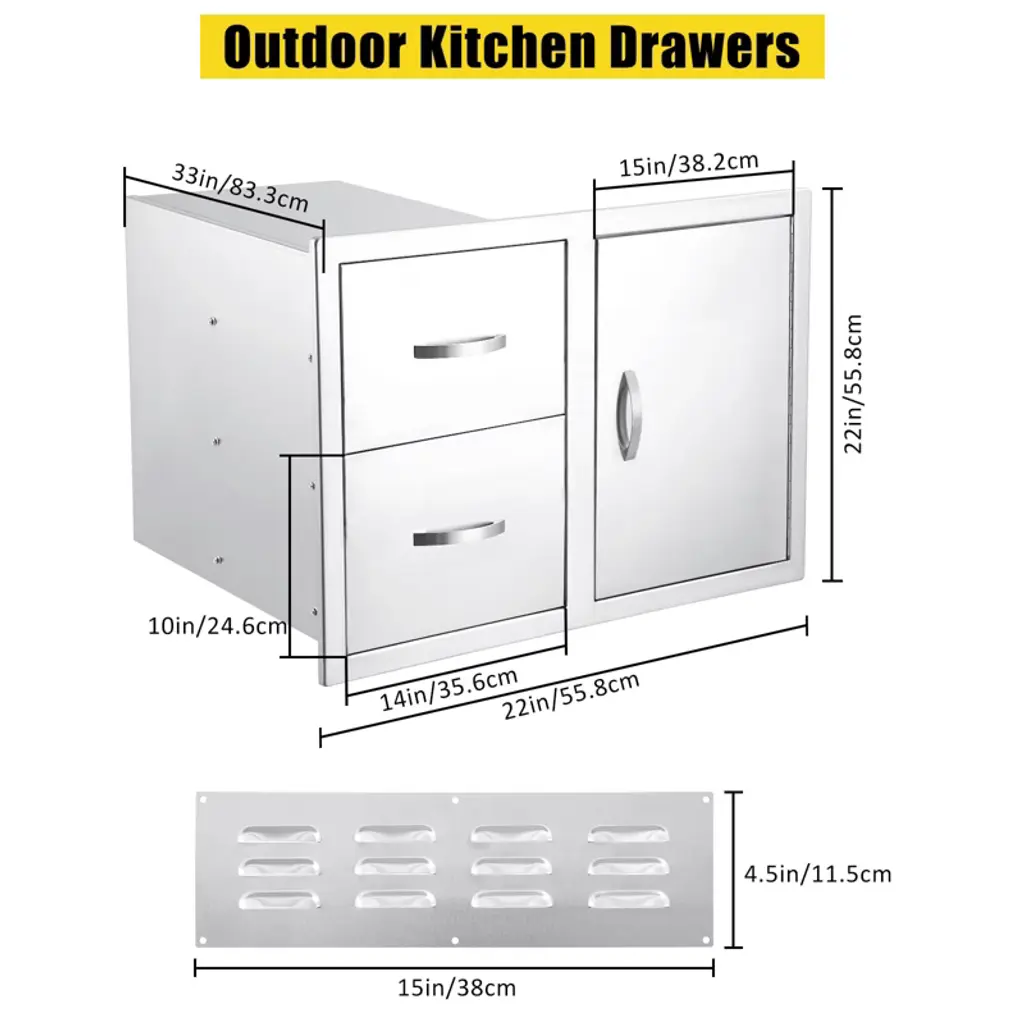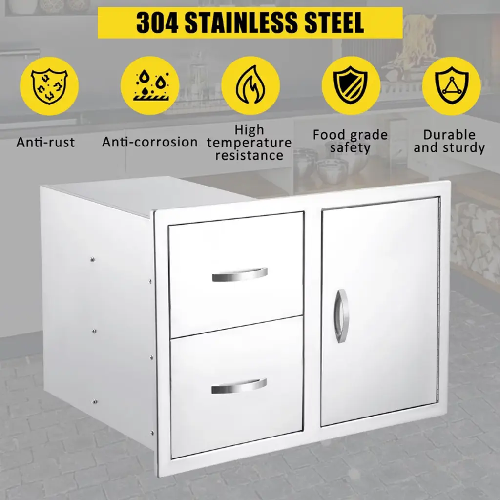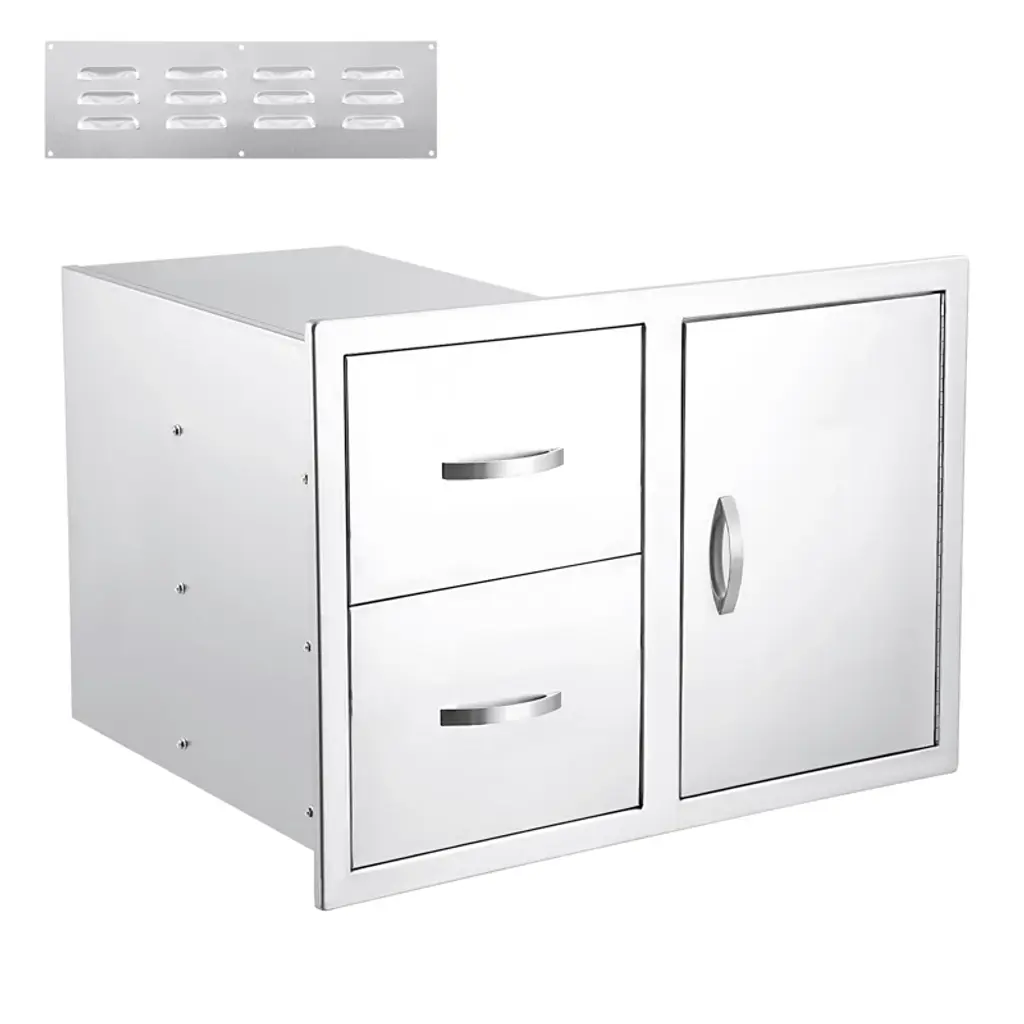 TROPOW Professional Outdoor Kitchen Cabinet System ¨C NSF-Certified Left Drawer & Right Door Combo with Vent Panel (33" Silver)1?? Commercial-Grade Construction ? Heavy-duty 304 stainless steel (NSF-certified) with double-wall reinforcement ? 33" extra-wide design accommodates large grill islands and outdoor kitchens ? Brushed fingerprint-resistant finish withstands harsh weather conditions2?? Smart Storage Solutions ? Integrated 7-hook organization system for BBQ tools and accessories ? 22" deep cabinet space fits standard propane tanks with room to spare ? Magnetic latching system provides secure closure while allowing airflow3?? Professional Ventilation System ? Included perforated vent panel prevents moisture and heat buildup ? Optimized airflow channels maintain proper circulation in enclosed spaces ? Ideal for high-heat applications near grills, smokers, and fire pits4?? Easy Professional Installation ? Pre-drilled mounting holes for quick flush installation ? Self-aligning heavy-duty hinges with smooth 95¡ã swing ? Reversible door configuration for flexible layout options5?? Premium Outdoor Performance ? Saltwater/chlorine resistant construction ? -40¡ãF to 600¡ãF temperature rating ? Lifetime rustproof guarantee?? Technical Specifications? Dimensions: 33"W ¡Á 22"H ¡Á 22"D? Material: 1.5mm 304 Stainless Steel? Weight: 68 lbs? Fire Rating: UL Classified??? Package Includes? Left drawer + right door assembly? 18"¡Á22" ventilation panel? Complete mounting hardware kit?? Pro Installation Tips:¡ú Use marine-grade silicone sealant for waterproofing¡ú Pair with outdoor-rated drawer slides (sold separately)¡ú Ideal for built-in pizza ovens and kamado grills?? Premium Features? Commercial-grade thickness? ADA-compliant ergonomic handle? NSF/ANSI 51 food equipment certified? 10-year structural warranty