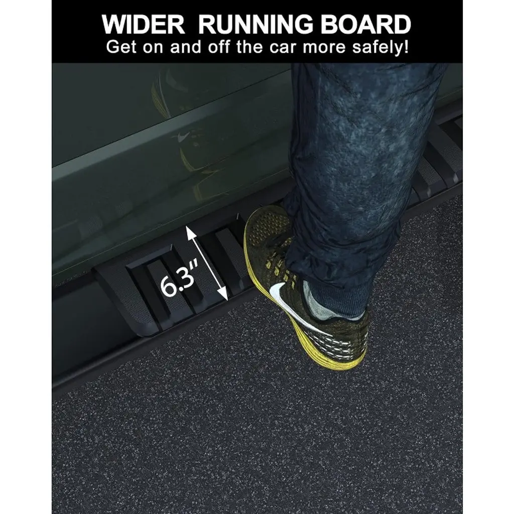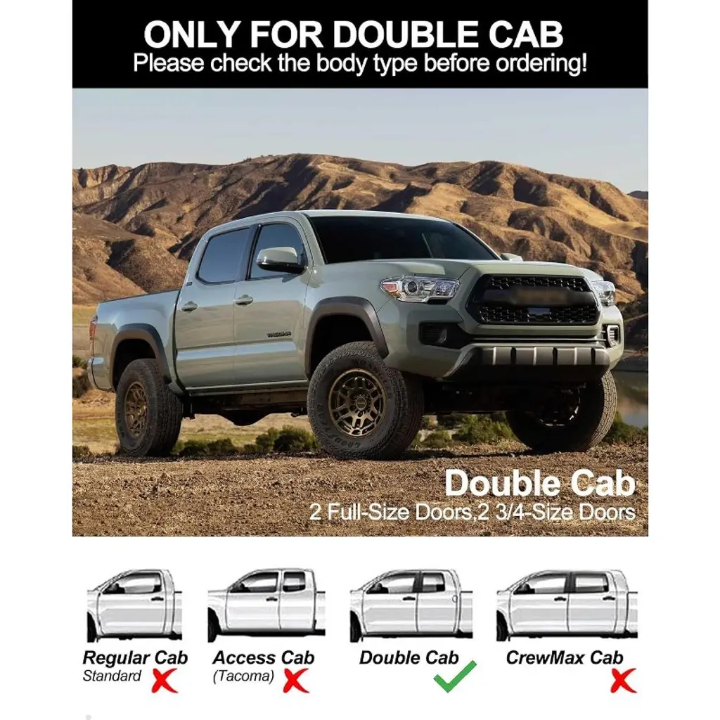 Upgrade Your Tacoma with Confidence-Boosting Running Boards Tired of awkward climbs into your truck? These precision-engineered running boards solve that problem permanently. Designed specifically for your 2005-2023 Tacoma Double Cab, they bolt directly to factory mounting points for a perfect OEM fit that looks like it came from Toyota. The military-grade 6061-T6 aluminum construction withstands 400+ pounds per side while resisting rust and corrosion - whether you're dealing with salty winter roads or muddy job sites. The 6.3" wide textured stepping surface gives you sure footing with deep drainage channels to prevent slips, whether you're wearing work boots or helping kids climb in after practice. Forget complicated installations. You'll be done in about 10 minutes with just basic tools - no drilling or modifications needed. The smart 10.5" ground clearance maintains your Tacoma's capability while the contoured design shields vulnerable rocker panels from debris. From daily commutes to weekend adventures, these running boards make every entry and exit safer and more comfortable. The professional finish complements your truck's rugged styling while standing up to real-world use. Finally, a simple upgrade that makes your Tacoma even more practical.