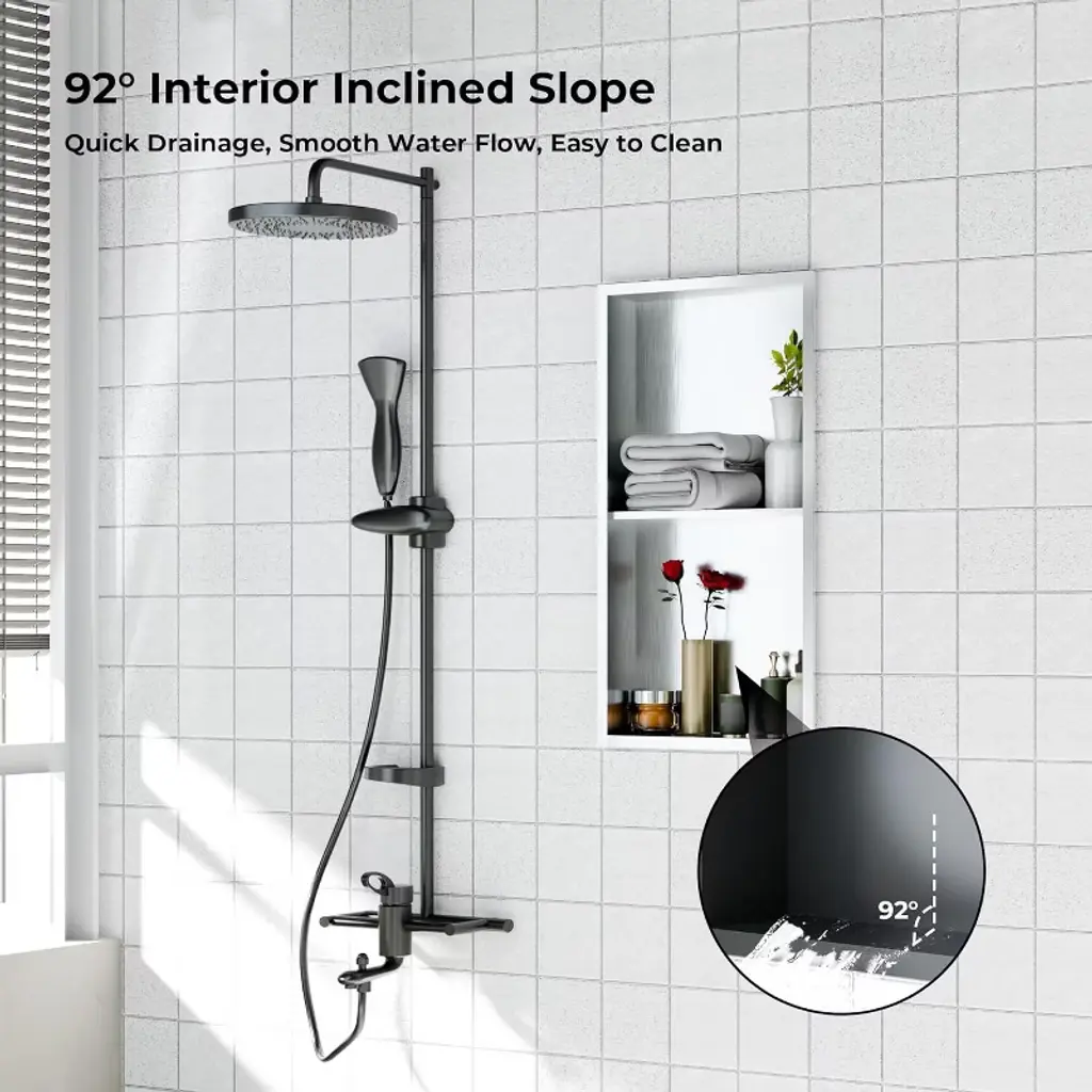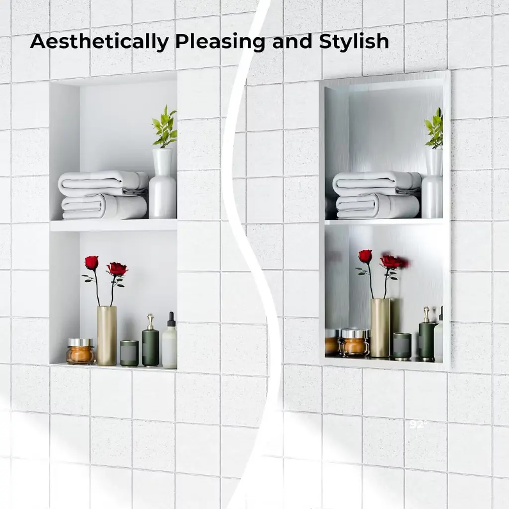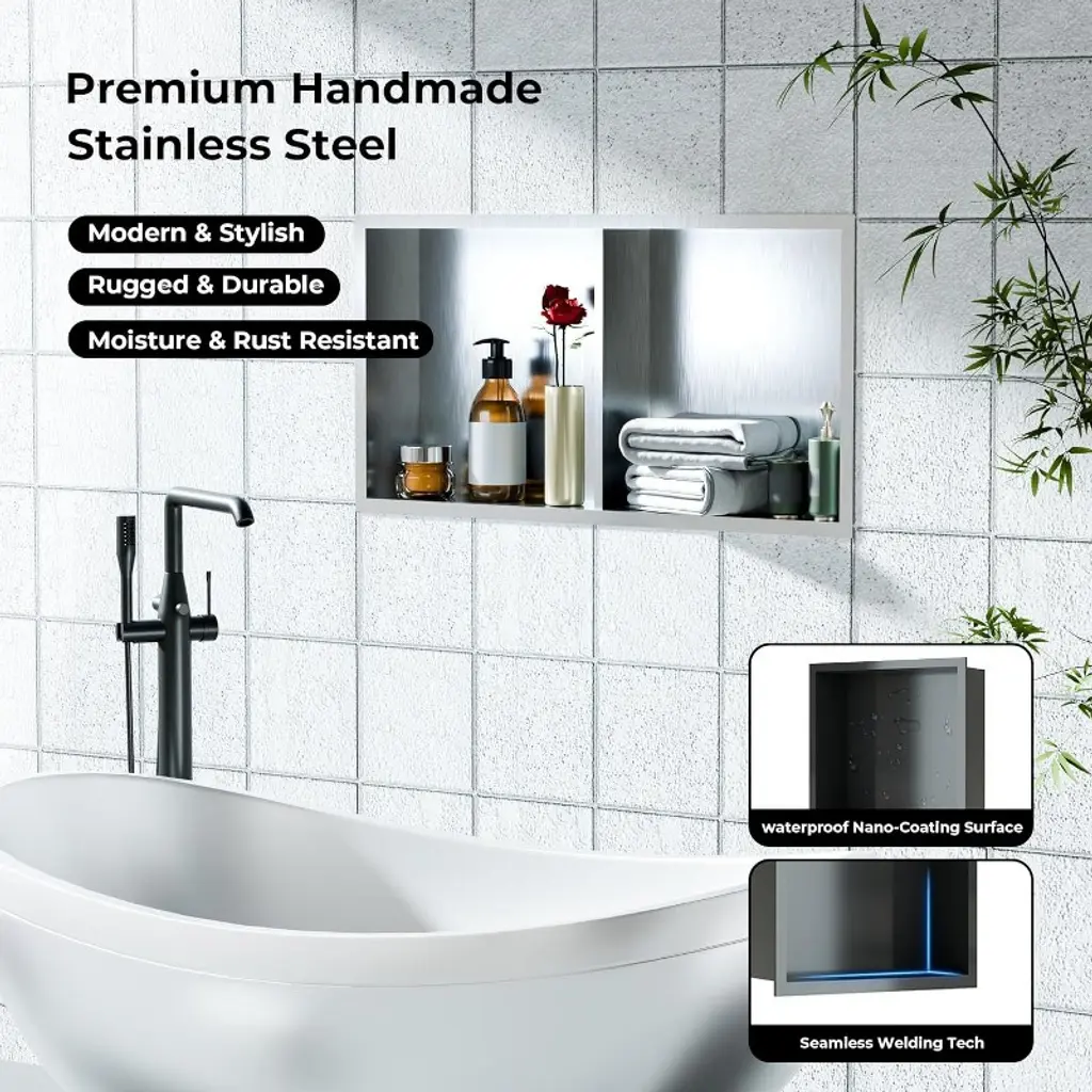 Upgrade your shower or living space with this premium stainless steel shower niche designed for durability and style. Crafted from high-quality stainless steel, it resists rust and maintains a sleek, modern look that complements any bathroom, kitchen, or living room wall. Its recessed design eliminates the need for complicated tile work, allowing for easy installation that saves both time and money. This niche provides ample storage space to neatly organize your shampoo, soap, and other essentials, helping you keep your shower or bathroom clutter-free and functional. Versatile enough to be installed in showers, kitchens, or living rooms, it adapts seamlessly to tiled or drywall surfaces, adding a practical yet stylish storage solution wherever you need it. The smooth stainless steel finish is not only visually appealing but also easy to clean, resisting stains and water spots to keep your space looking fresh with minimal effort. Whether you're renovating or just looking to improve your organization, this shower niche offers a combination of convenience, durability, and modern design that makes everyday routines simpler and your space more inviting. Its thoughtful construction and user-friendly installation process mean you can enjoy professional-quality results without hassle, bringing order and elegance to your home.