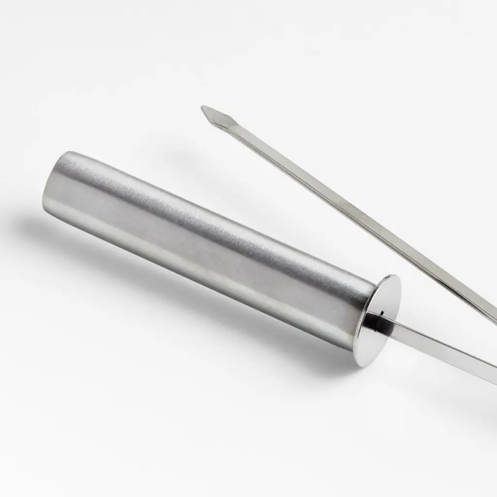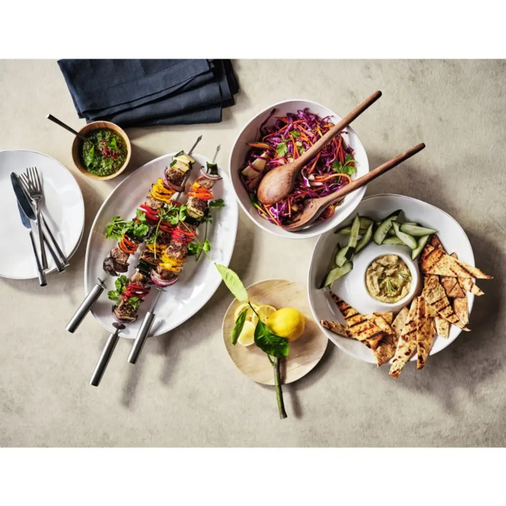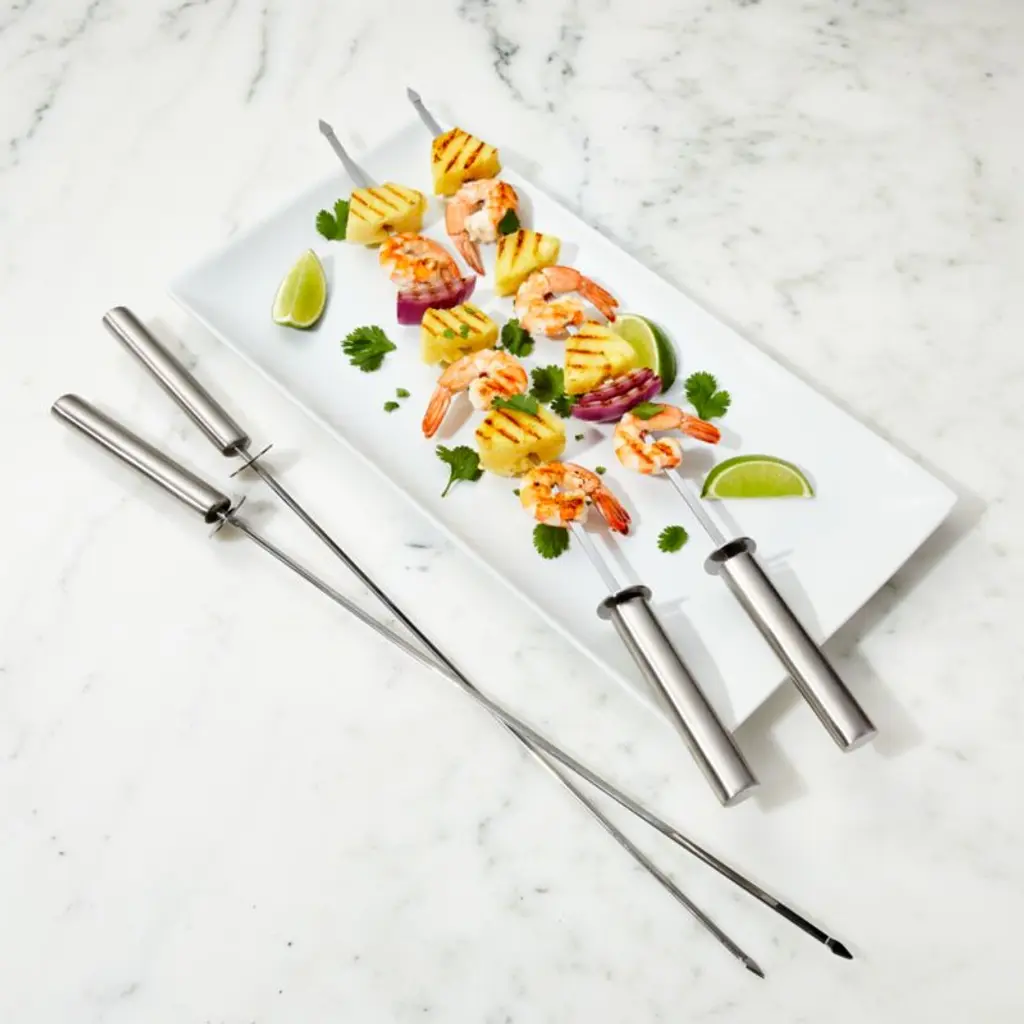 Sturdy skewers are a grilling must-have, holding small chunks of meat, vegetables and fruit together in colorful kebabs, and this exclusive set is ingenious. Thread cherry tomatoes, onion wedges and cubes of beef or tofu onto these four skewers and place them on the grate. Use the hollow handles to flip them so everything is cooked deliciously on all sides. Once it is time to feast, use the clever integrated sliding disc to slide all of the fantastic grilled food onto your plate in one smooth motion.