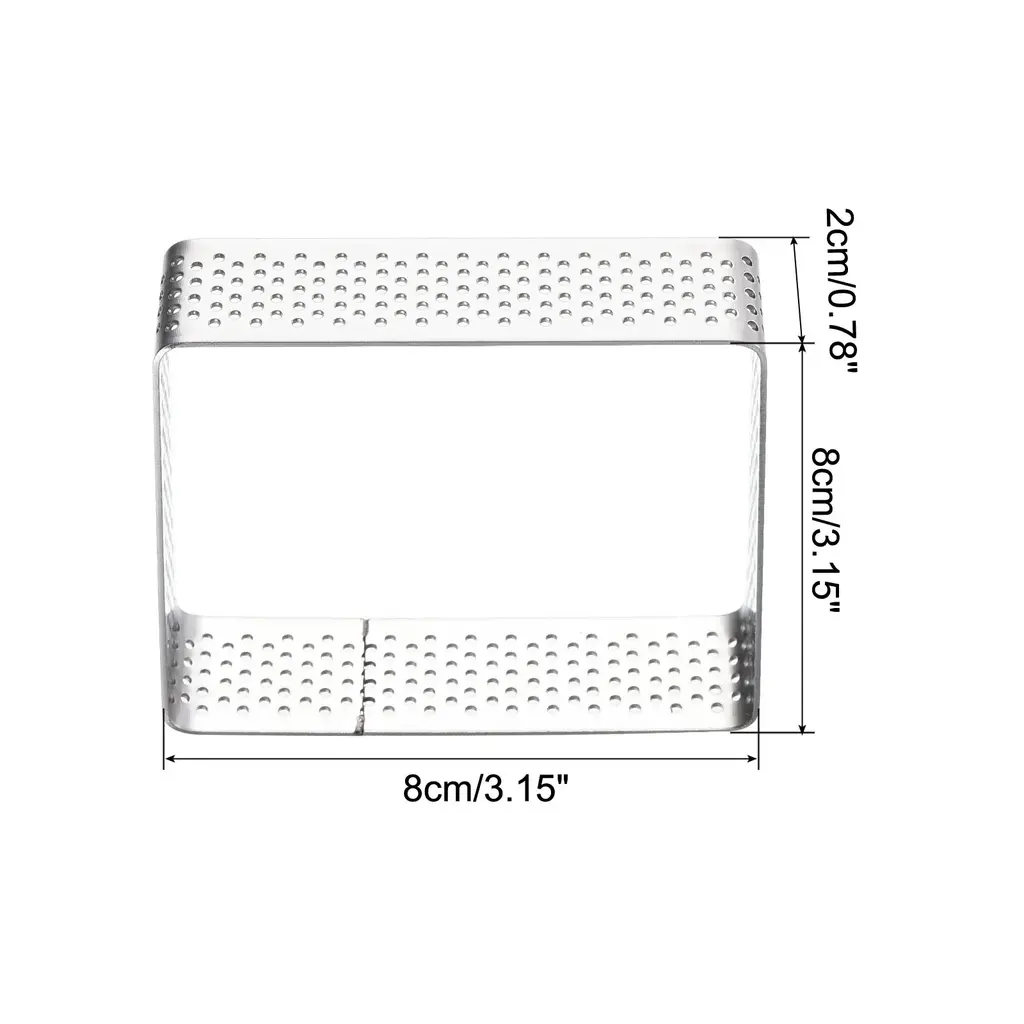 Why Choose Small Cake Rings?These cake rings are made of stainless steel, high temperature, corrosion-resistant and rust resistant, not easy to deform, lasting for long term use.The square cake ring has a venting hole design and the venting holes are evenly distributed and ventilated without leaking.Non-stick coating can reduce the use of edible oil and cooking time, reduce energy consumption, and is easier to release.Suitable for making mousse cake, bread, biscuit, cookies, chocolate, etc;microwave, freezer, dishwasher safe.Great for families, hotels, baking rooms, restaurants, cafés, bakeries and so on.It can be placed in ovens, microwaves, dishwashers, refrigerators, etc.Specification:Material: Stainless steelColour: SilverShape: SquareSize: 8 cm x 8 cm x 2 cm /3.15" x 3.15" x 0.78" (L*W*H)Package Included: 1pcs x Cake Ring
