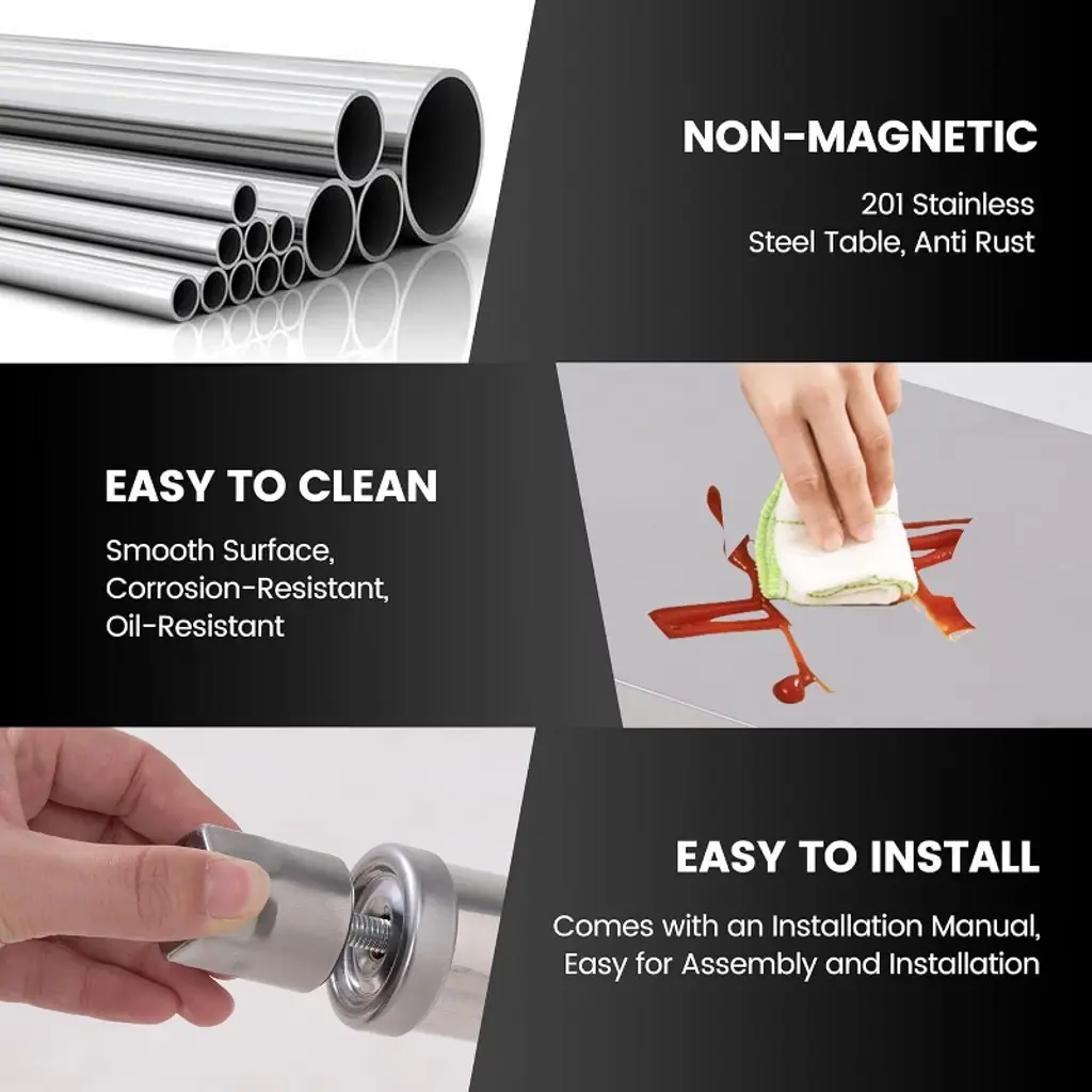 Easy to Maintain: Made from high-quality stainless steel, this kitchen prep table resists rust, stains, and corrosion. Its smooth, non-porous surface wipes clean in seconds, making it ideal for busy chefs, bartenders, or outdoor cooking. Whether in a commercial kitchen or home setup, hygiene is effortless.
