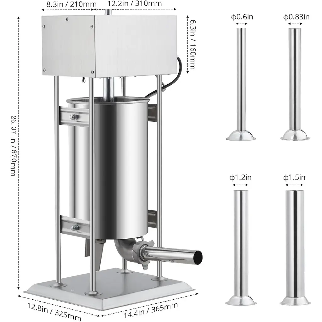 Powerful 200W Motor: This sausage stuffer is equipped with a robust 200W motor, delivering efficient and long-lasting performance ideal for commercial use. It is designed to ensure quick and seamless sausage stuffing, meeting professional standards for consistent and reliable results every time. Infinitely Adjustable Speed: Featuring a stepless speed adjustment and a convenient foot switch, this machine allows you to achieve precise control over the stuffing process. This innovative design minimizes manual intervention, enabling you to make sausages faster and with less hassle. 5 Versatile Sausage Tubes: The sausage stuffer comes with five stainless steel tubes of varying sizes (Φ15mm, Φ21mm, Φ30mm, Φ37mm, and Φ45mm), catering to a wide range of sausage types. Whether you're making thin Italian sausages or thick meat sausages, this accessory set provides the flexibility you need for different recipes. Stainless Steel Build: Built to last, the sausage stuffer features a solid stainless steel body, base, barrel, and tubes. The use of food-grade materials ensures that all components that come into contact with food are safe and hygienic, giving you peace of mind with every use. Easy to Use and Clean: Designed with a vertical configuration for efficient sausage production, this machine is user-friendly with easy assembly and disassembly. Its design allows for quick and thorough cleaning after each use, simplifying the sausage-making process and ensuring a hassle-free experience.