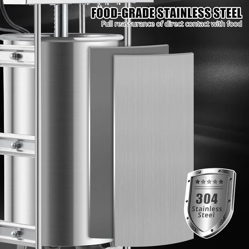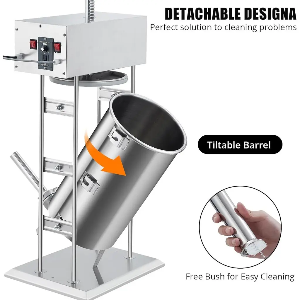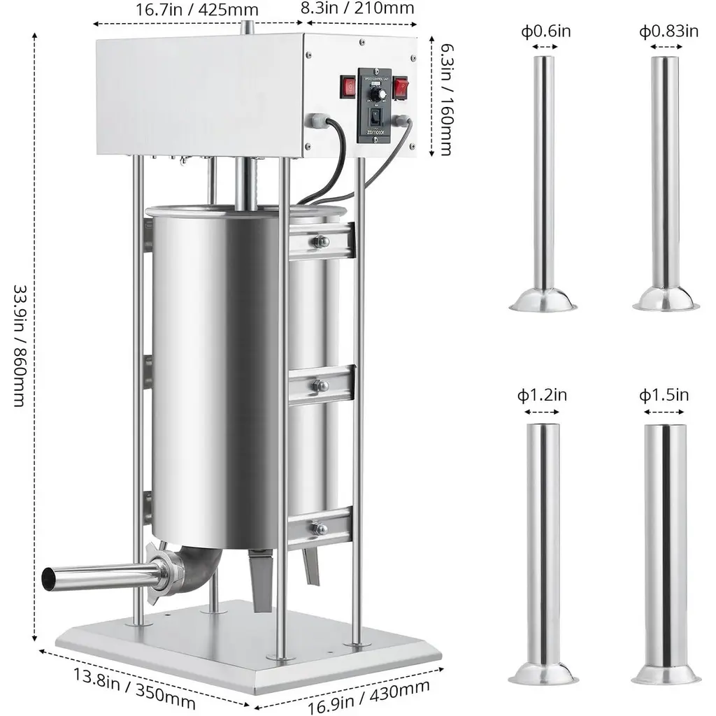 Powerful 200W Motor: This sausage stuffer is equipped with a robust 200W motor, delivering efficient and long-lasting performance ideal for commercial use. It is designed to ensure quick and seamless sausage stuffing, meeting professional standards for consistent and reliable results every time. Infinitely Adjustable Speed: Featuring a stepless speed adjustment and a convenient foot switch, this machine allows you to achieve precise control over the stuffing process. This innovative design minimizes manual intervention, enabling you to make sausages faster and with less hassle. 5 Versatile Sausage Tubes: The sausage stuffer comes with five stainless steel tubes of varying sizes (Φ15mm, Φ21mm, Φ30mm, Φ37mm, and Φ45mm), catering to a wide range of sausage types. Whether you're making thin Italian sausages or thick meat sausages, this accessory set provides the flexibility you need for different recipes. Stainless Steel Build: Built to last, the sausage stuffer features a solid stainless steel body, base, barrel, and tubes. The use of food-grade materials ensures that all components that come into contact with food are safe and hygienic, giving you peace of mind with every use. Easy to Use and Clean: Designed with a vertical configuration for efficient sausage production, this machine is user-friendly with easy assembly and disassembly. Its design allows for quick and thorough cleaning after each use, simplifying the sausage-making process and ensuring a hassle-free experience.