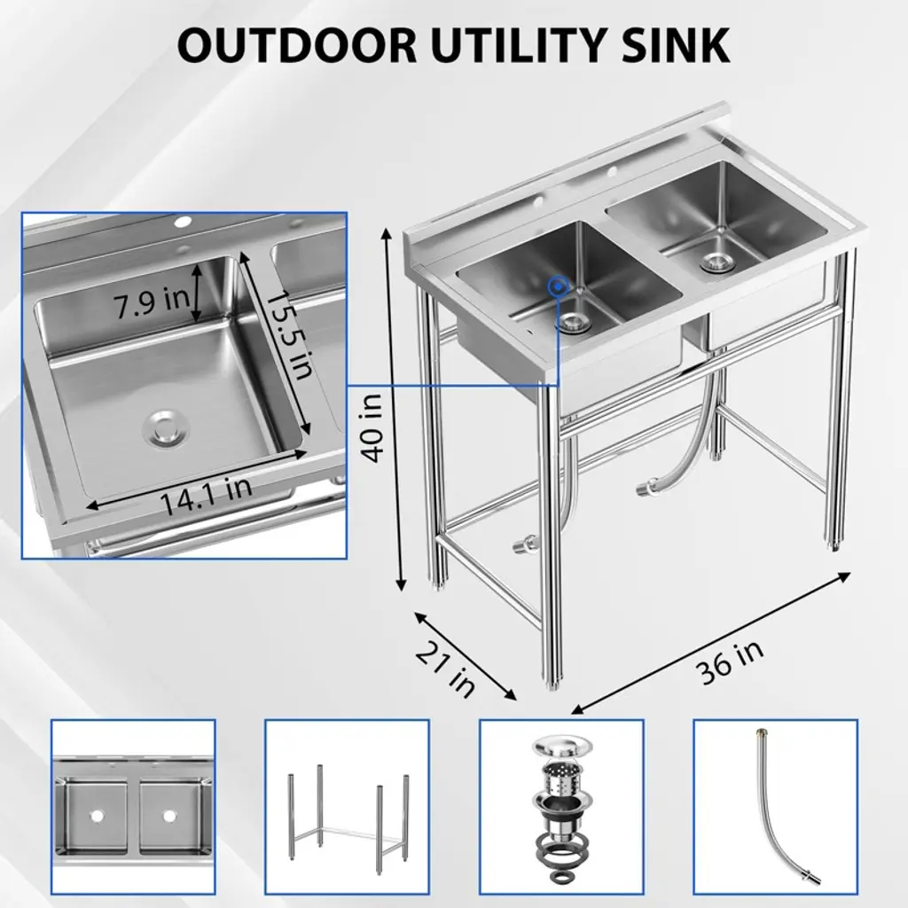 Stainless Steel Utility Sink with Adjustable Legs and Spacious Compartment, Free-Standing Design, Versatile Use, and Easy-Clean & Anti-Splash Features