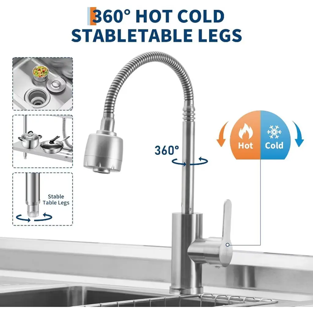 Picture this: a single space where you can wash vegetables, scrub paint brushes, soak laundry, and organize all your tools without cluttering your countertops. This commercial-grade utility sink brings professional functionality to your home or workspace, designed to handle whatever messy jobs come your way. The smart dual-material construction combines a sturdy 201 stainless steel frame with a durable 304 stainless steel bowl - the same materials used in restaurant kitchens. It stands up to years of heavy use while resisting rust and stains, whether you're using it indoors or outdoors. The spacious 39.5" x 19.5" work surface gives you room to tackle large pots or stacks of dishes, while the 2" backsplash keeps water where it belongs. What really sets this apart is the thoughtful organization system. The pull-out drawer hides cleaning supplies or tools out of sight, while the included knife rack, S-hooks, and dish rack keep essentials within easy reach. No more searching for that scrub brush or measuring cup when you need it. The professional pull-down faucet makes cleanup effortless - switch between a gentle rinse for delicate items and a powerful spray for stuck-on grime. The 362° rotation reaches every corner of the basin, and the temperature control ensures comfortable handwashing year-round. Adjustable legs compensate for uneven floors in garages or outdoor areas, while non-slip feet keep the unit stable during use. Whether you're installing it as a garage cleaning station, laundry room helper, or outdoor prep area, it adapts to your space rather than demanding special accommodations. From holiday meal prep to weekend DIY projects, from pet baths to garden tool cleaning - this versatile station handles it all while keeping your space organized. Finally, a utility sink that works as hard as you do, day after day.