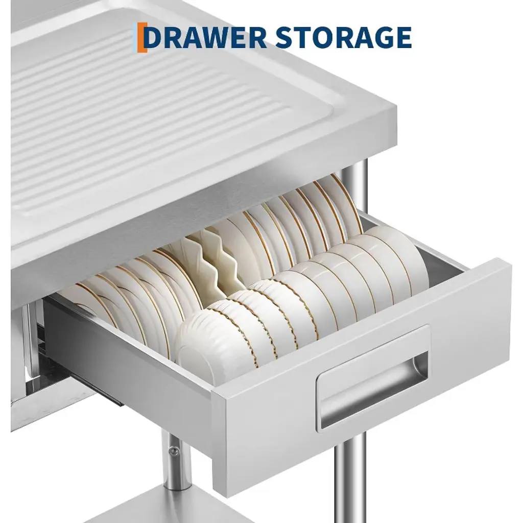 Stainless Steel Utility Sink, Workbench & Storage Drawer, Includes Pull-out Faucet & Knife Rack, Adjustable Legs For Kitchen, Garage, Laundry
