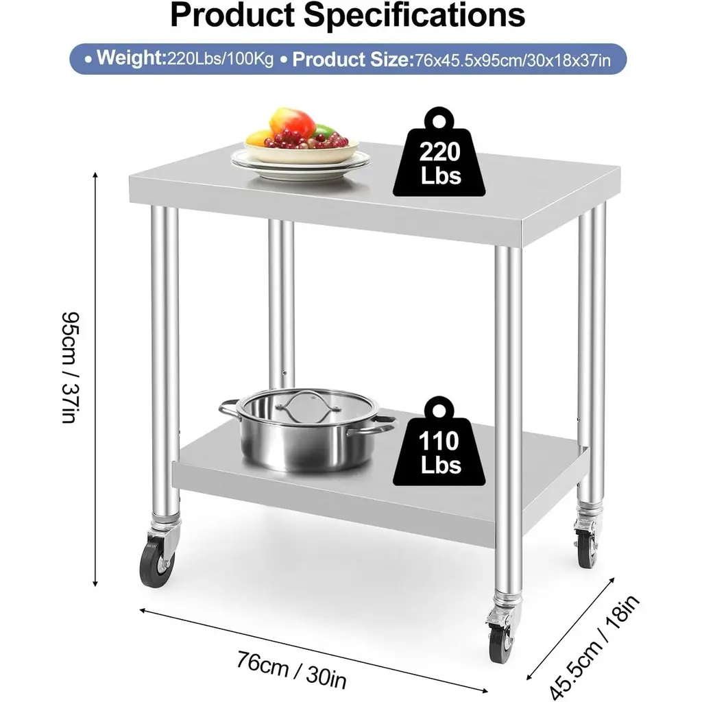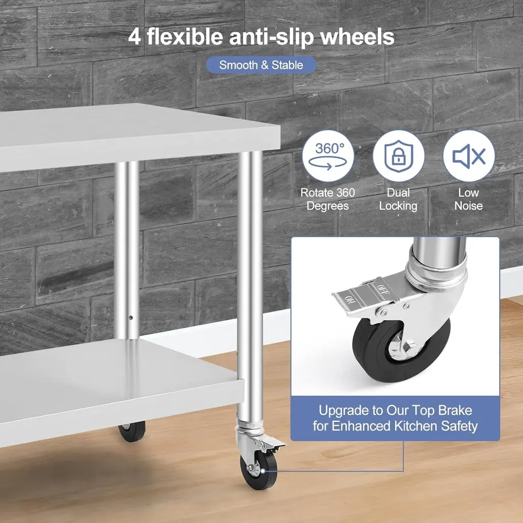 Durable & Easy to Clean: This prep table features a brushed stainless steel surface that resists rust and corrosion, ensuring long-lasting durability. Its easy-to-clean design makes it ideal for kitchens and restaurants. Ample Storage Capacity: With a weight capacity of 300 pounds, this stainless steel table offers ample storage for kitchen utensils, tools, and more. Adjustable Undershelf: The adjustable-height undershelf increases the table's practicality by allowing customization for specific storage needs. This feature makes it versatile for organizing items of various sizes in any setting. Mobile & Stable Design: This heavy-duty rolling cart features four caster wheels, two with brakes, providing easy maneuverability and secure positioning. It's ideal for settings that require frequent relocation, ensuring stability when locked in place. Multiple Application: This versatile work table is perfect for a range of settings, including kitchens, garages, workshops, bars, restaurants, and hospitals. It serves as an ideal workbench or repair station in any commercial environment.