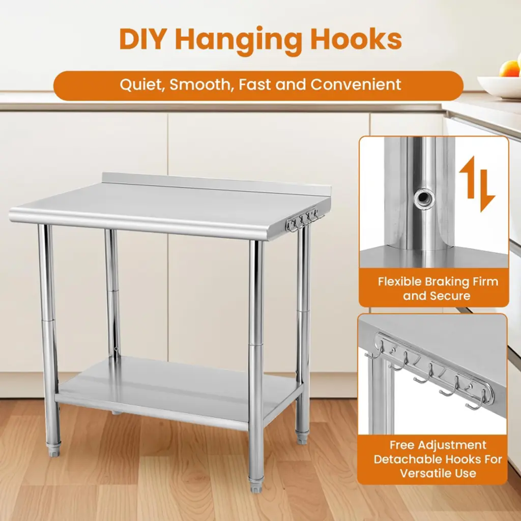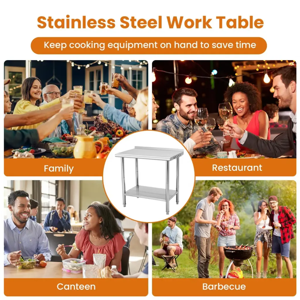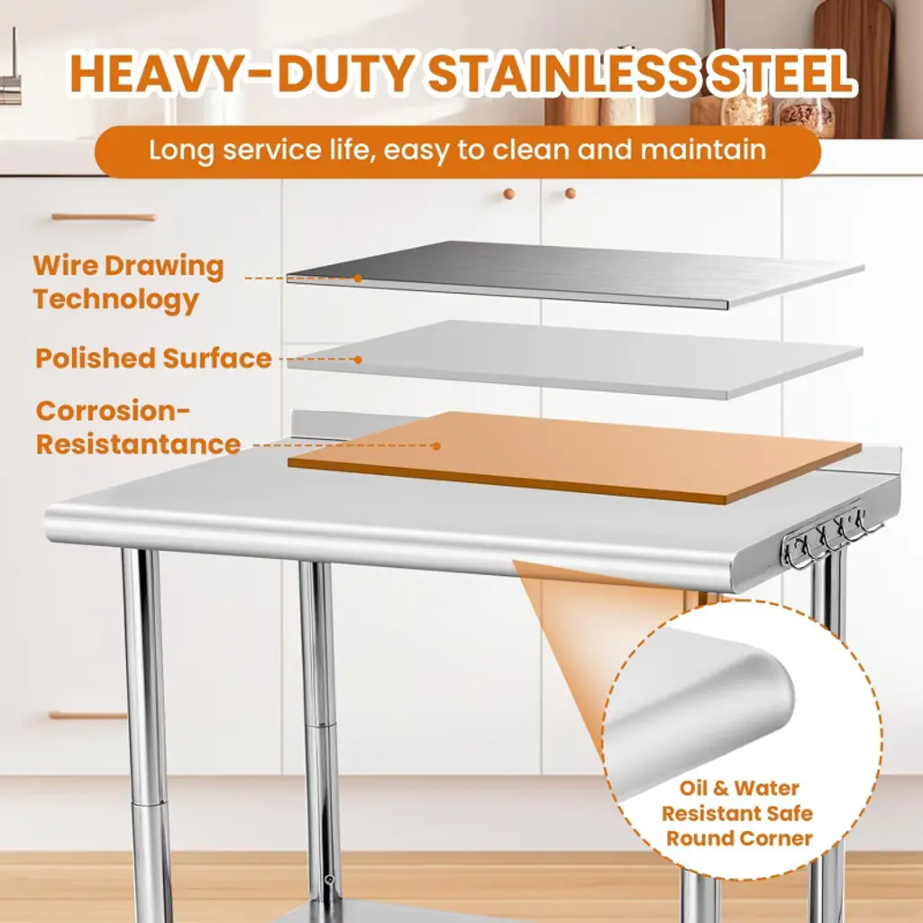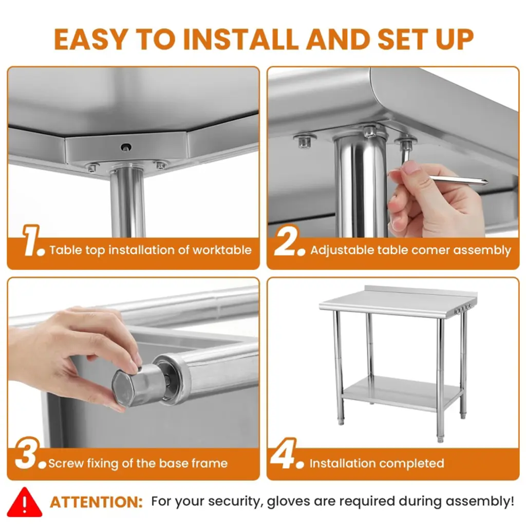 **Commercial-Grade Stainless Steel Work Table ¨C NSF-Certified Prep Station with Adjustable Shelf & Casters** ### **Professional Features** 1. **Premium 304 Stainless Steel Construction** - **1.2mm thick #304-grade** (18/8 chromium-nickel alloy) - **Brushed #4 finish** (hides scratches/fingerprints) - **Seamless welds** (NSF-certified hygienic design) - **500¡ãF heat resistant** (withstands commercial kitchen use) 2. **Optimized Workspace Dimensions** - **36"L ¡Á 24"W ¡Á 35"H** (standard work height) - **4" integrated backsplash** (liquid containment) - **0.5" radiused edges** (OSHA-compliant safety) - **22 sq.ft work surface** (fits 6 sheet pans) 3. **Smart Storage & Mobility** - **Adjustable undershelf** (18"-26" height range) - **6 stainless steel utility hooks** (15lb capacity each) - **4 dual-locking casters** (2 rigid + 2 swivel) - **500lb dynamic load capacity** 4. **Commercial-Grade Durability** - **Salt-spray tested 2000+ hours** - **Chemical-resistant to:** * Bleach solutions * Commercial degreasers * Food acids - **Magnetic knife strip compatible** 5. **Multi-Industry Versatility** - **Restaurant prep stations** - **Butcher block tables** - **Laboratory work surfaces** - **Industrial workbenches** - **Food truck kitchens** ### **Technical Specifications** - **Material:** 304 stainless steel (ASTM A240) - **Frame:** 14-gauge tubular legs - **Surface:** 16-gauge (1.2mm) - **Weight Capacity:** 750lb static load - **Certifications:** NSF/ANSI 2, FDA 21CFR **Complete Package Includes:** - 1 stainless steel table - 1 adjustable shelf - 6 utility hooks - 4 industrial casters - Assembly hardware kit - 5-year commercial warranty