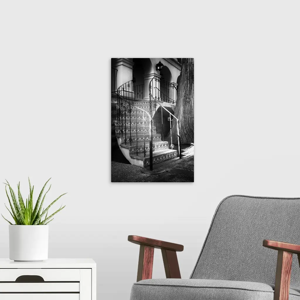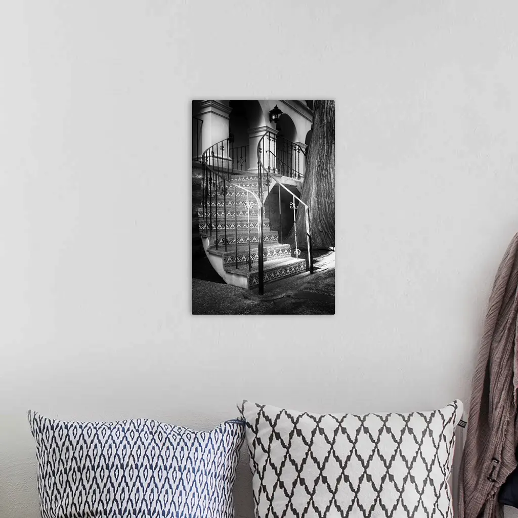 Wrought Iron Staircase of a Traditional Building in Black and White with a Light Stream, Riverwalk, San Antonio, Texas