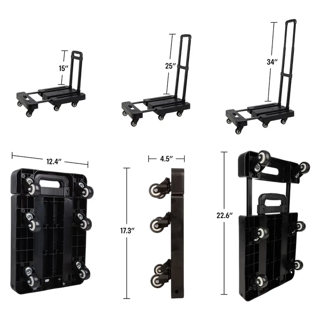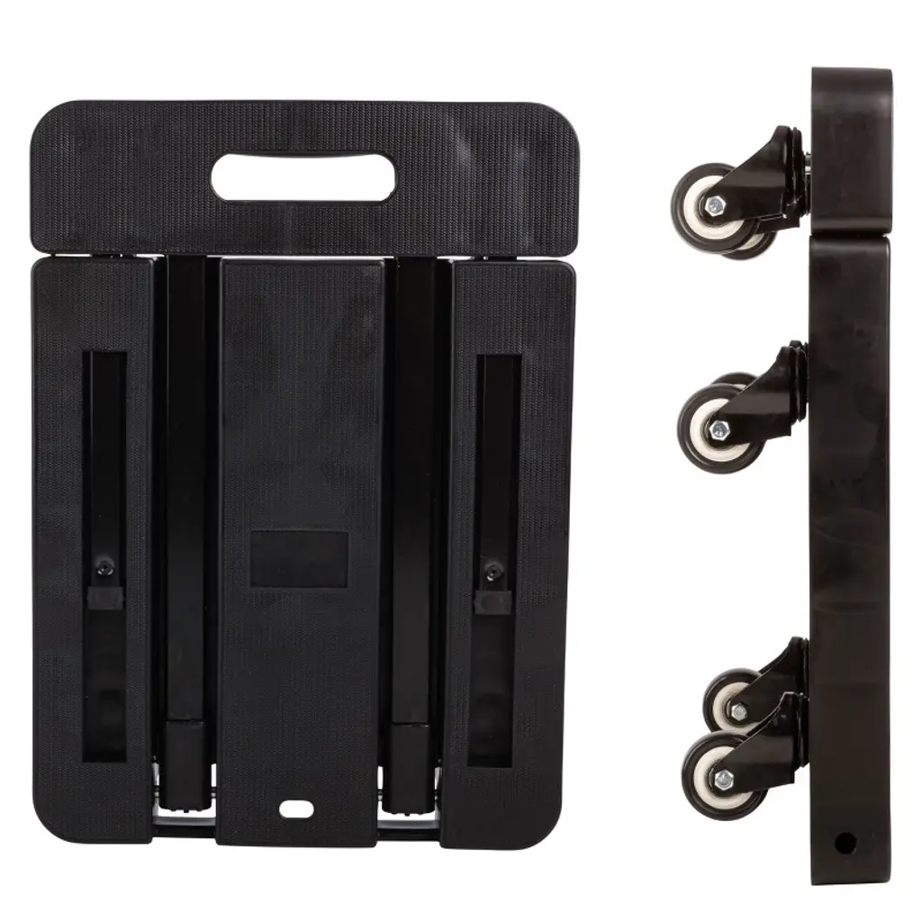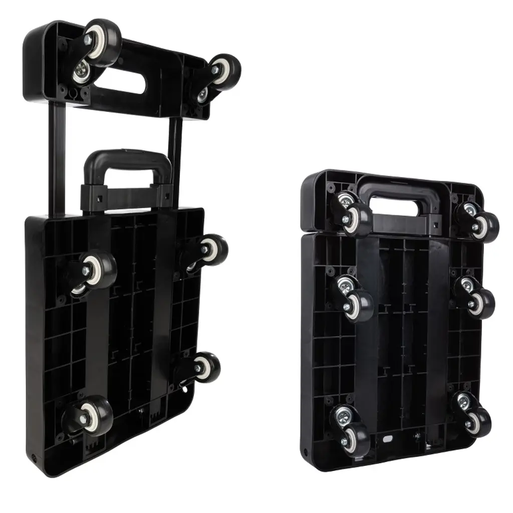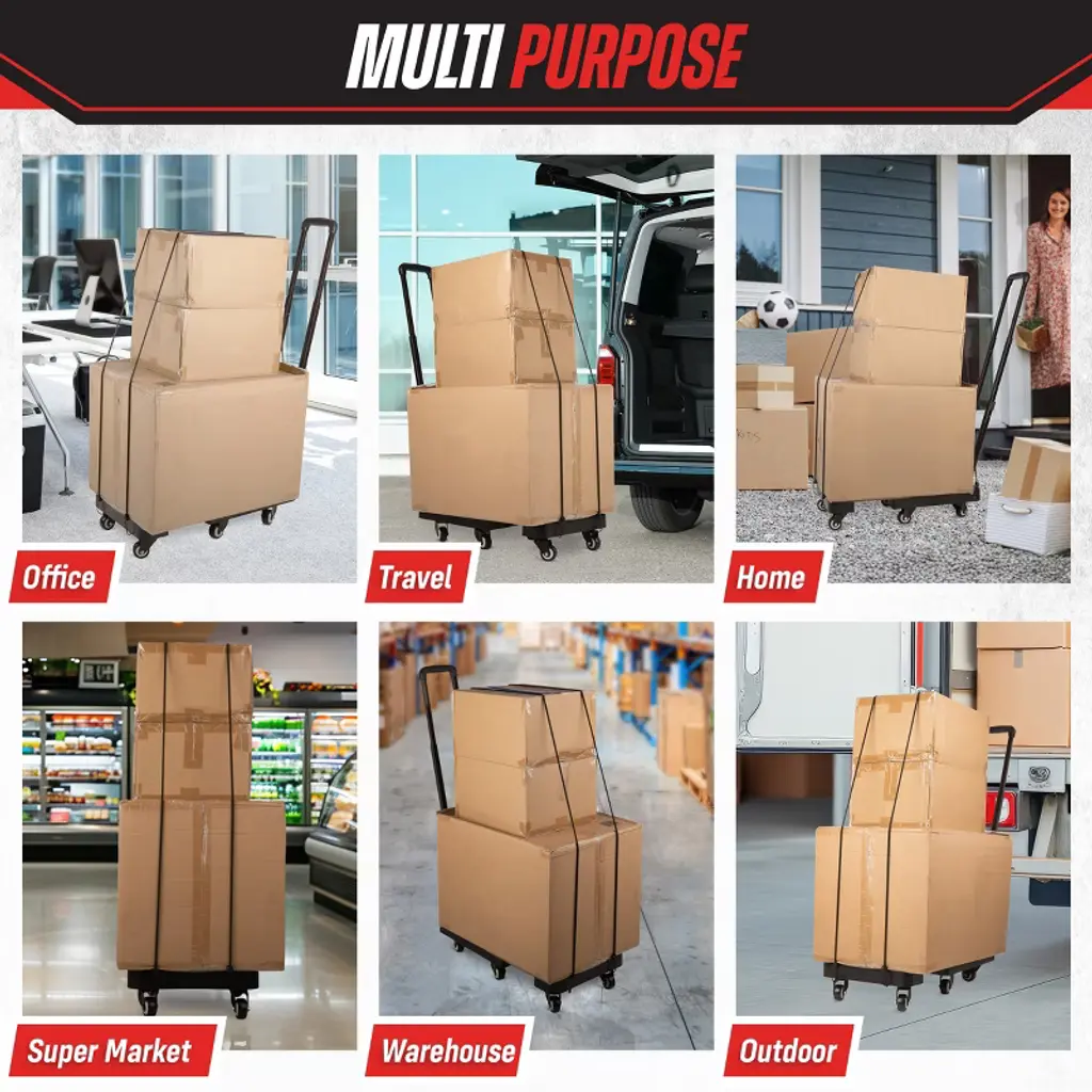 Transport loads up to 500-pounds with ease with the Stalwart Hand Dolly Foldable Cart. This folding utility cart with wheels has a collapsible design, folding down to a compact 4.5-inches-tall for easy flat storage and transport. The telescoping handle allows you to select your comfortable working height, while the six 360-degree swiveling casters make it easy to get moving. Stalwart, for dollies with wheels and other moving supplies that are smart, strong, and secure.