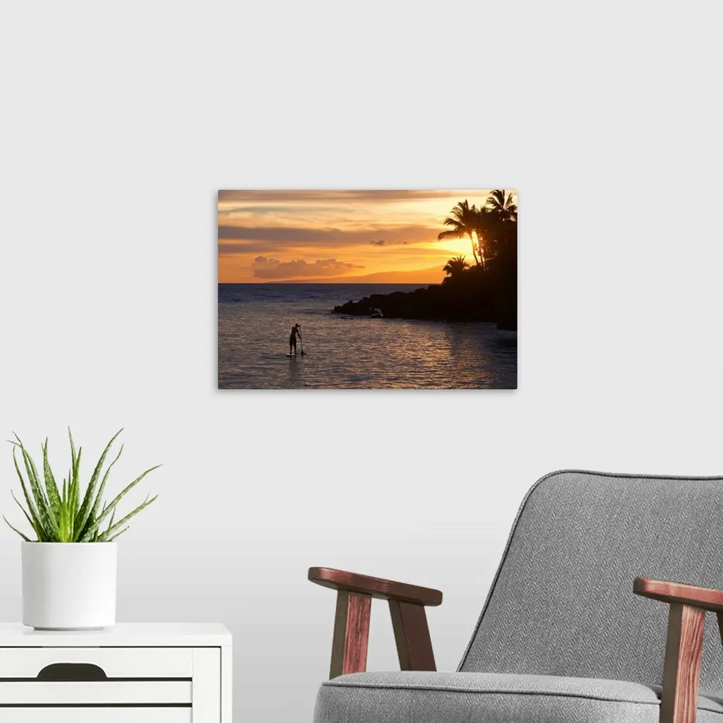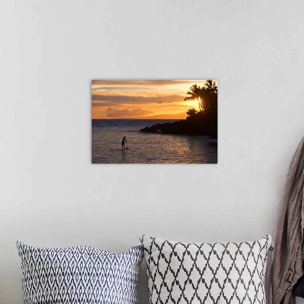 Stand-Up Paddler At Sunset On Maui, Hawaii