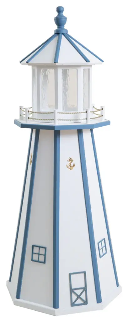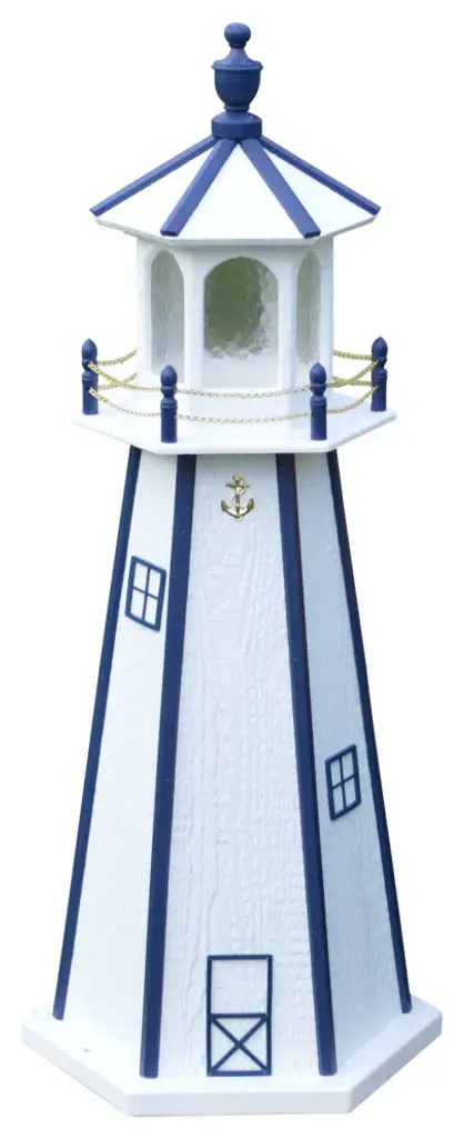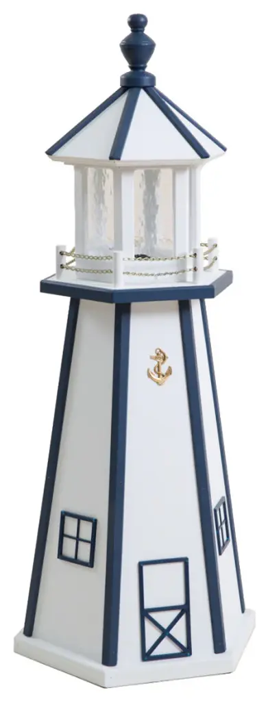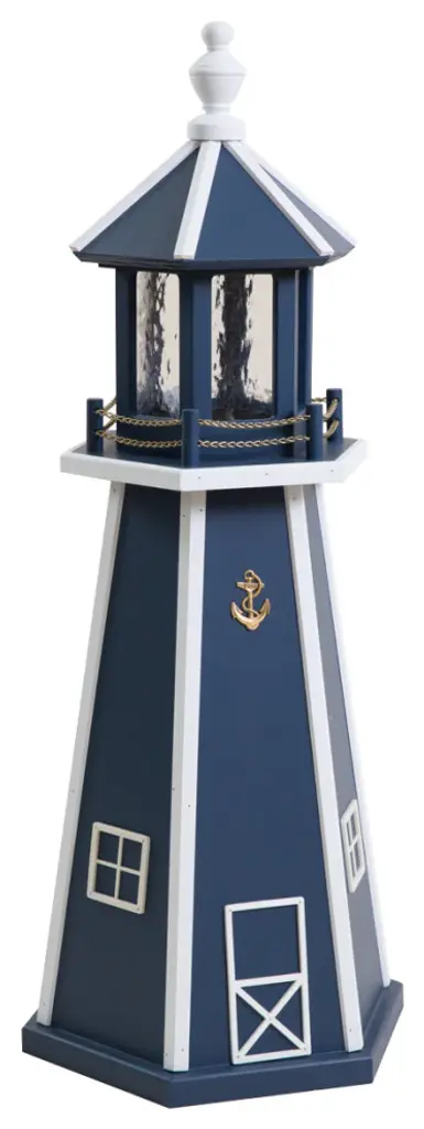 Hand-built in the USA by skilled Amish craftsmen, these lighthouses are made from LP Smartside panels.Amish made in the USAMade from LP Smartside panelsResists rotting, splitting, racking, and warping12" ground stakes includedComes standard with a 25 watt electric bulb