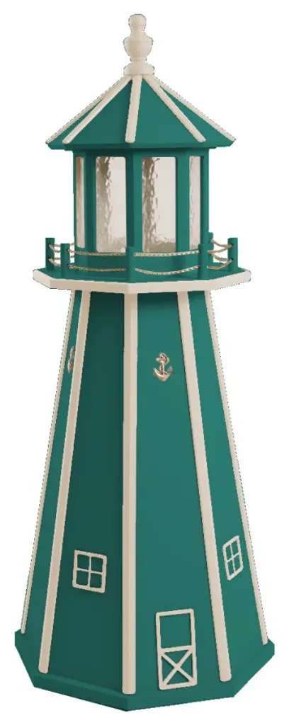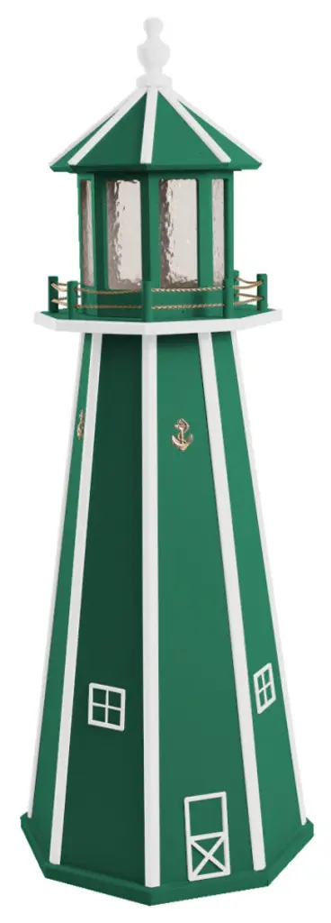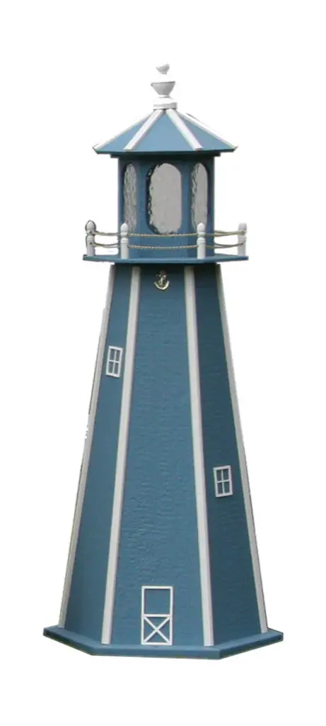 Hand-built in the USA by skilled Amish craftsmen, these lighthouses are made from LP Smartside panels.Amish made in the USAMade from LP Smartside panelsResists rotting, splitting, racking, and warping12" ground stakes includedComes standard with a 25 watt electric bulb