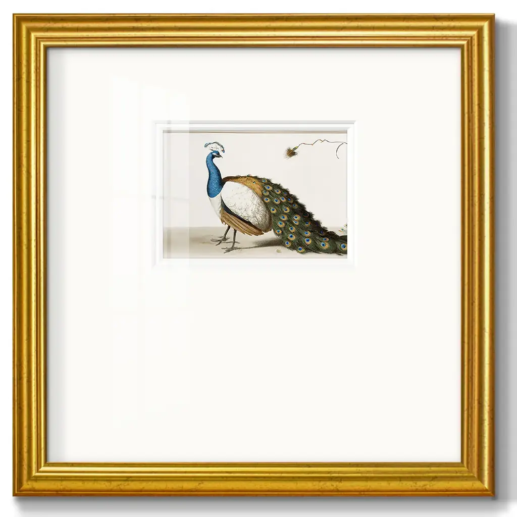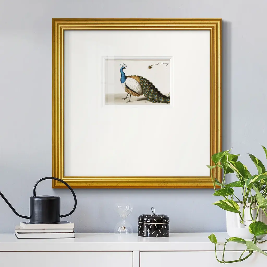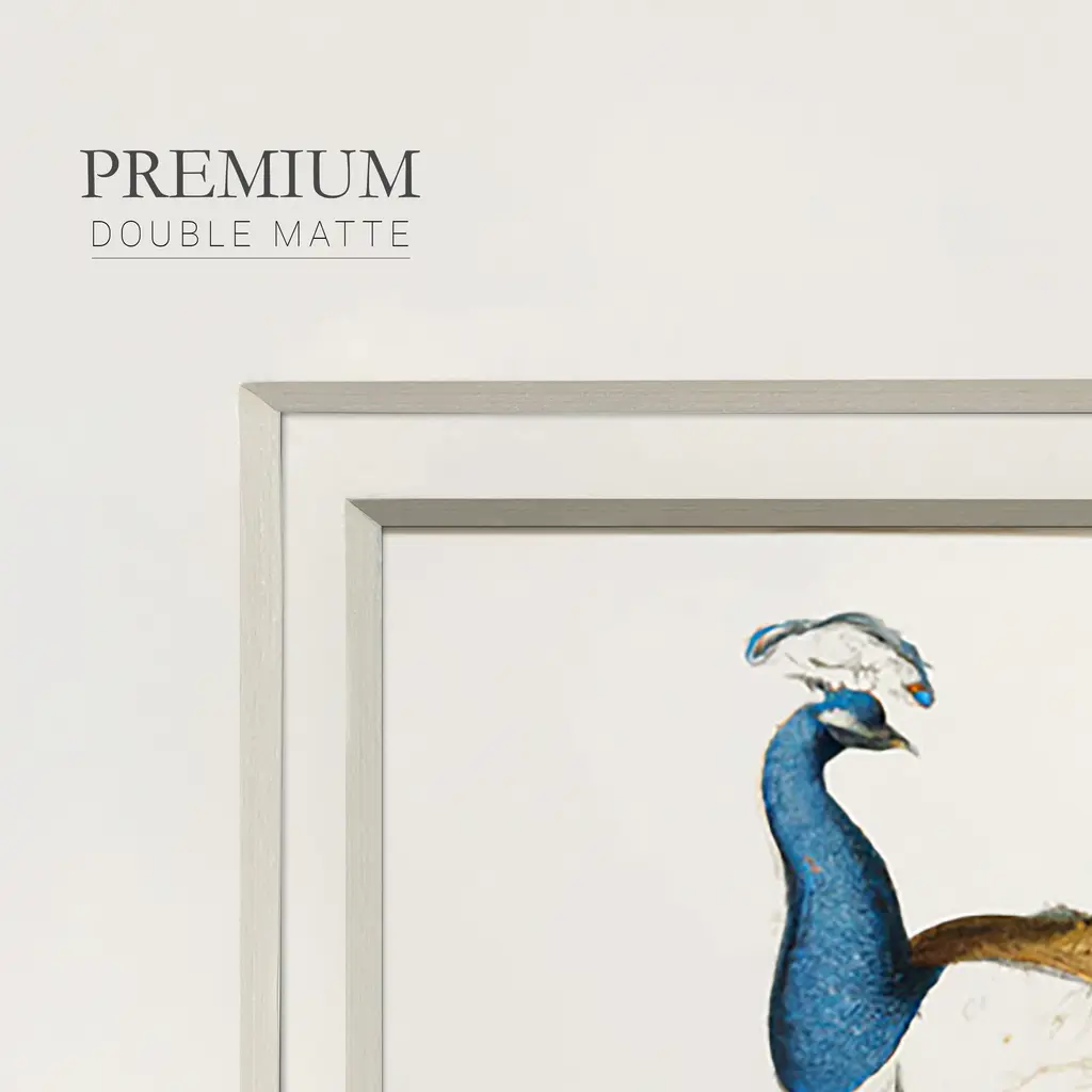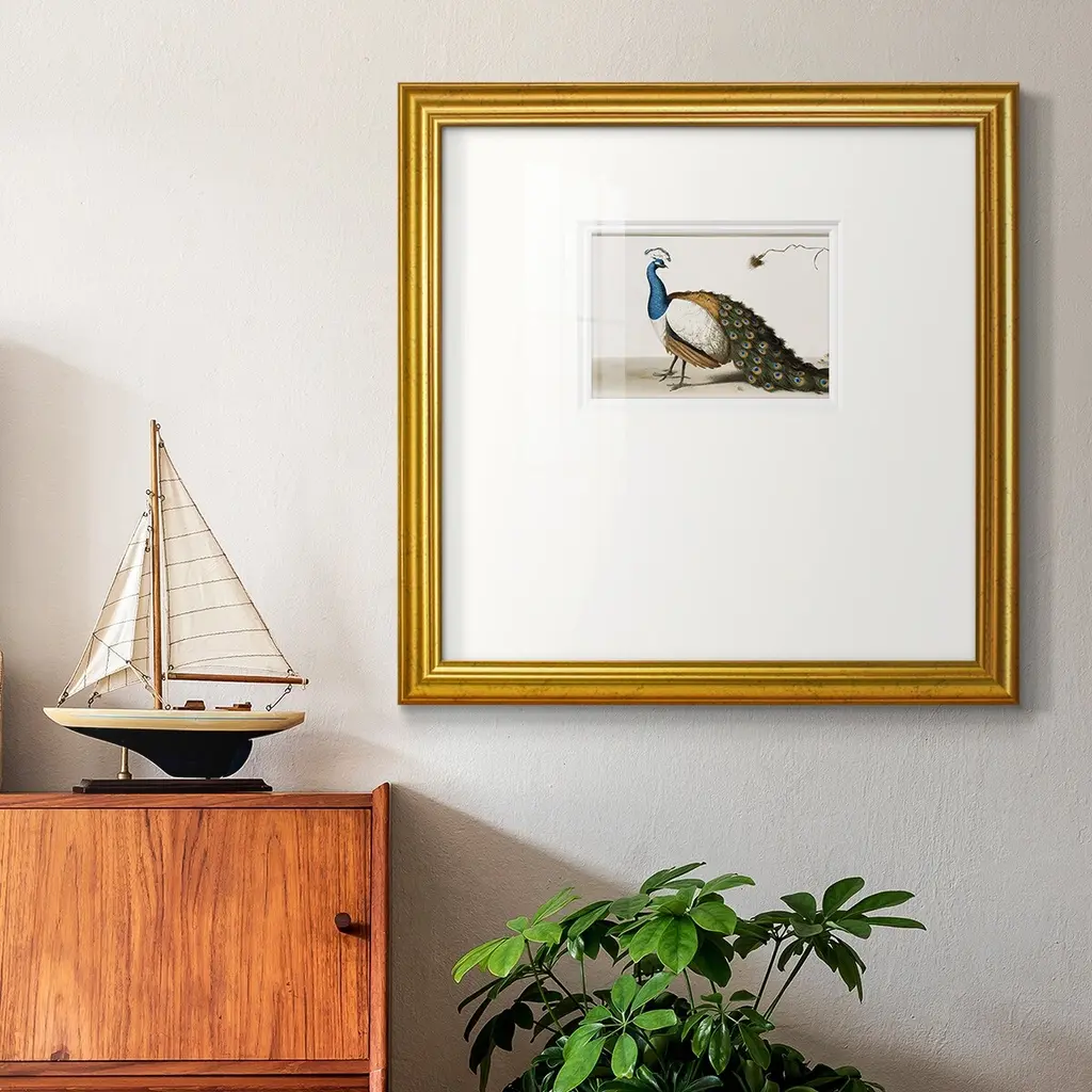 Standing PeacockPremium Framed Print A framed cold pressed paper print featuring superior double matting and quality frame. 2 SIZES AVAILABLE 16''X16''' - Overall Size 20''X20''' - Overall Size Each piece is made to order. Each piece comes with hanging hardware. Made in the USA Ready to Hang Giclee Paper Print Plexiglass Beveled Matt Board Double Matte Board