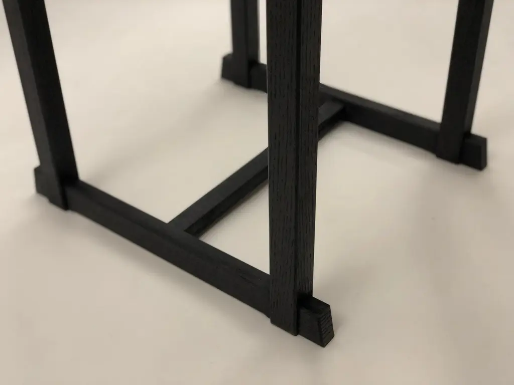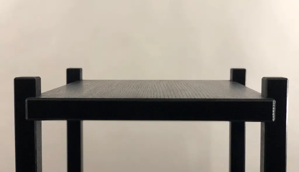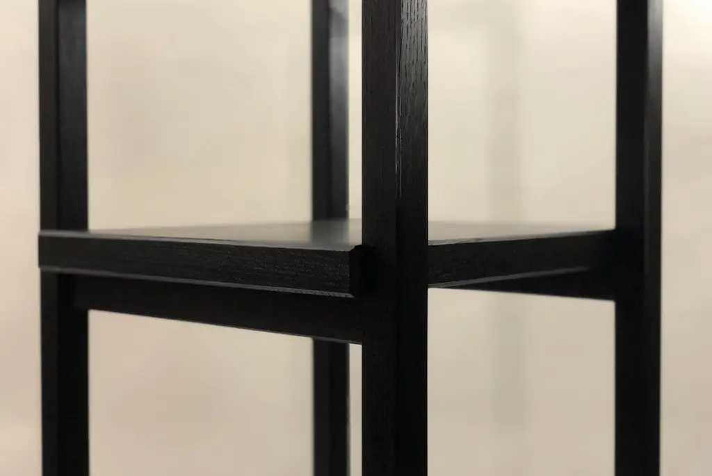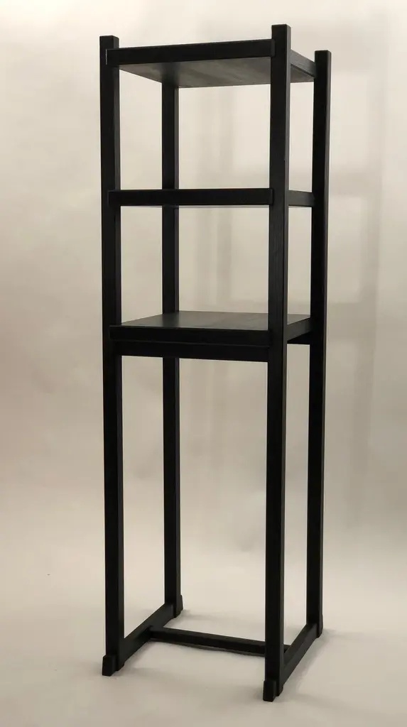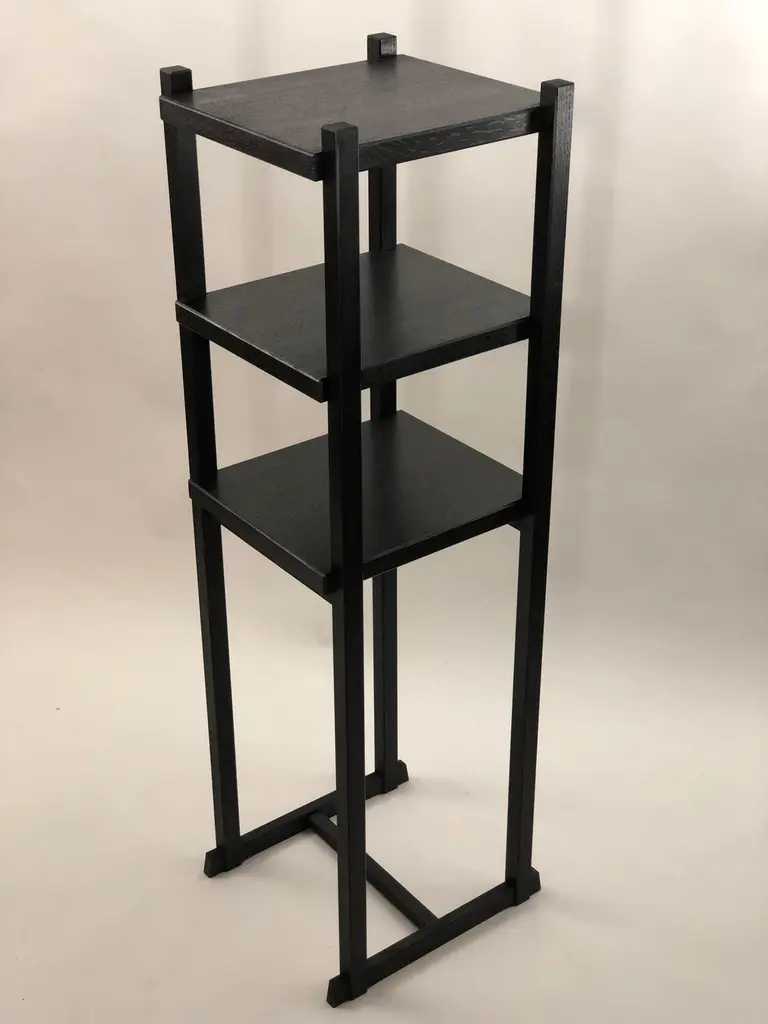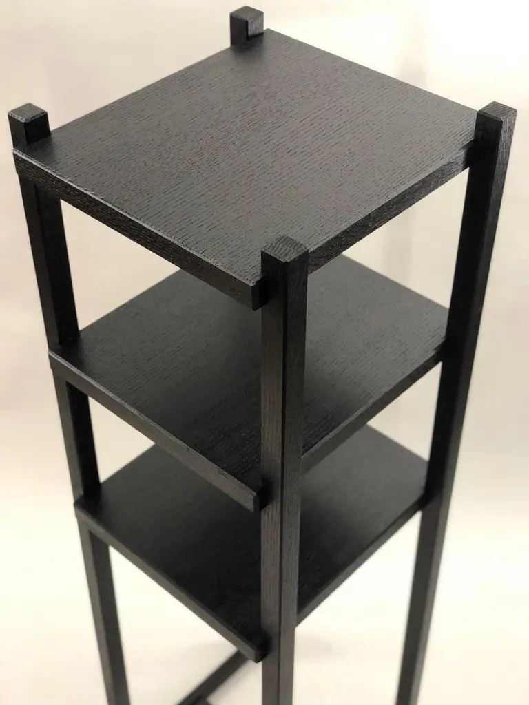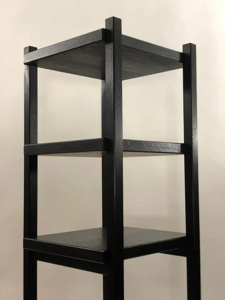 These standing shelves are created utilizing traditional interlocking joinery to form a lightweight, strong and durable structure. Offsets are planned into each joint to allow for careful chamfering of every part, making for a soft hand that encourages the tactile experience.The shelves are ebonized in a traditional processes in which utilizes the woods own tannins to create a deep brown scale ebony. This process does not fill the woods pores and so the structure and quality of the wood remain unobscured.
