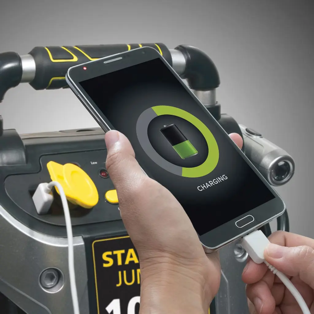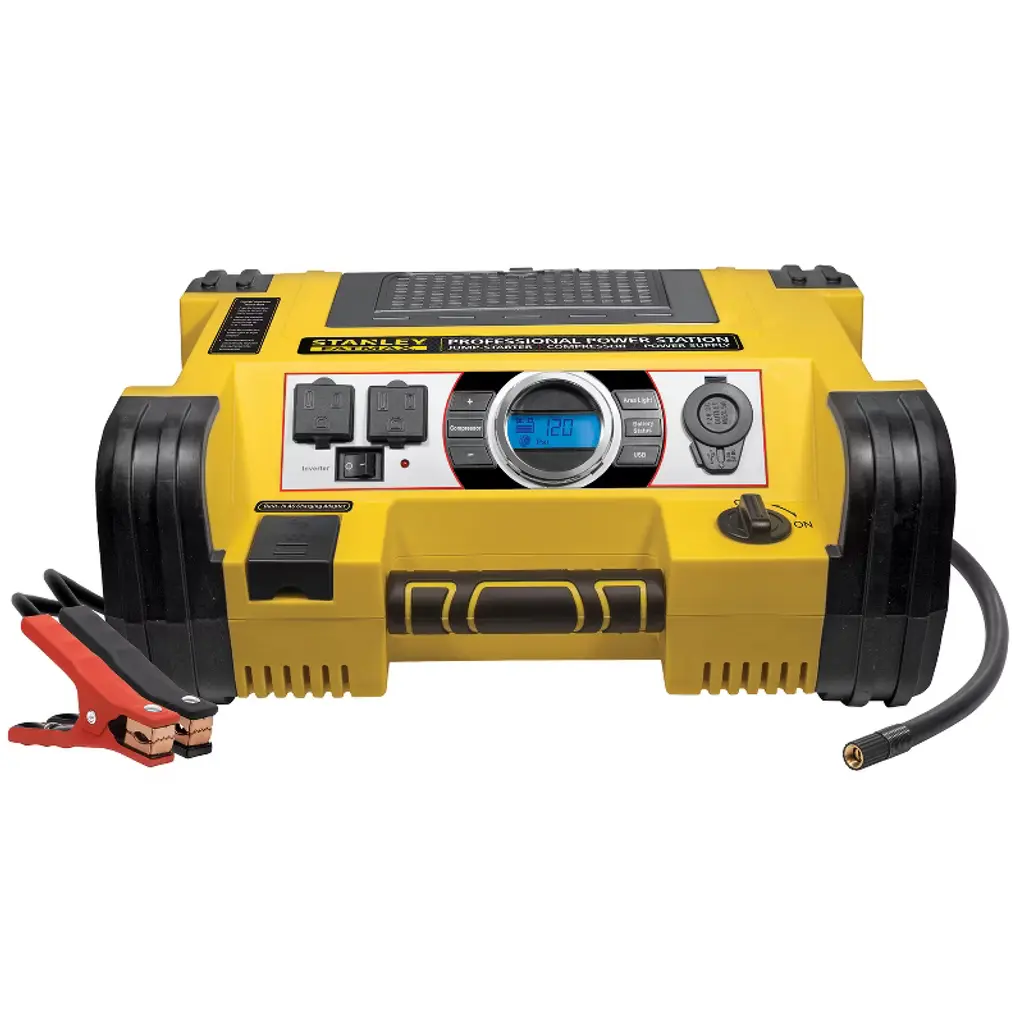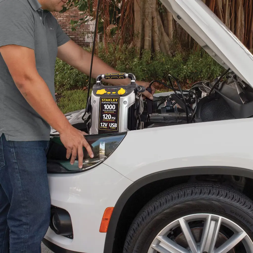 Every car owner dreads the day when their car's battery just won't start, especially when stranded alone without another car in sight. Fortunately, you can stay prepared with the STANLEY® 1,000-Peak-Amp Jump Starter with Air Compressor. This device packs 1,000 peak amps, providing a convenient, portable solution to jump-start your battery without relying on another vehicle. Simply connect the hook and clamps to your battery, turn on the switch, and start your vehicle. A built-in safety system sounds an alarm if the clamps are connected incorrectly. Moreover, this jump box doubles as a portable power station, featuring a built-in USB port - highly useful for charging your phone - and a 120-PSI air compressor, handy for low tires or inflating toys and sports equipment. Offering enough power to jump-start your car, truck, motorcycle, boat, RV, or tractor, the STANLEY® Battery Jump Starter is ideal for both everyday use and roadside emergencies. Easy-to-read LED indicators display remaining power reserve, while the covered 120-volt AC socket allows you to effortlessly recharge the unit using an extension cord (extension cord sold separately). Remember: charge the unit every 30 days if it's not in use; after use, charge it immediately overnight.