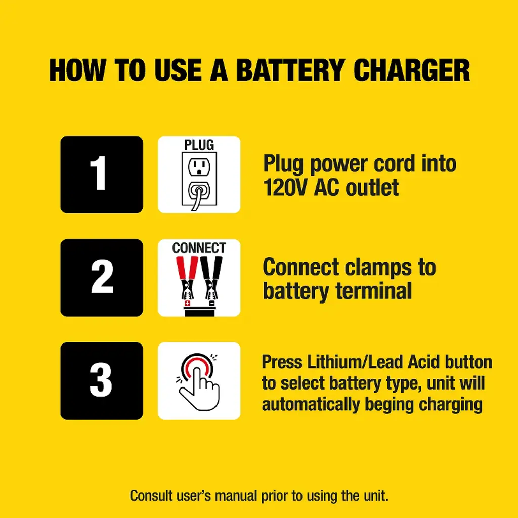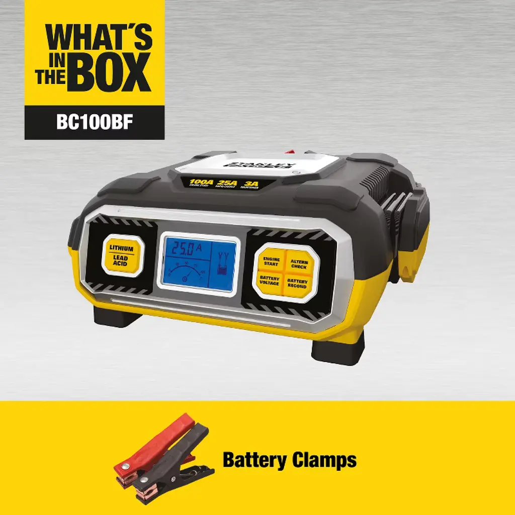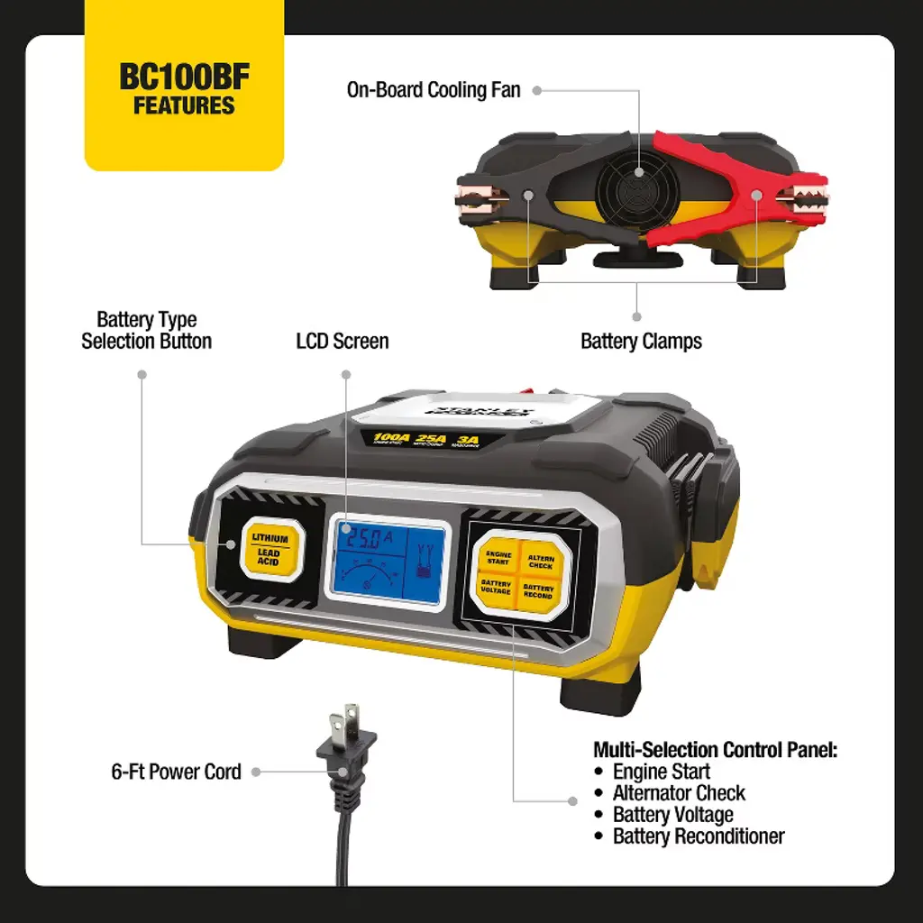 The STANLEY® BC100BF gives you convenient, automatic charging for your 12-volt AGM, GEL, or WET batteries, plus LiFePO4 (Lithium Iron Phosphate Batteries). This handy unit functions as a battery charger, maintainer, and trickle charger. Its fully automatic high-frequency charging restores lost battery performance for stronger engine starts and extended battery life. The built-in circuit protection guards against overcharging and reverse polarity. The easy-to-read LCD screen lets you see operation and charging status.