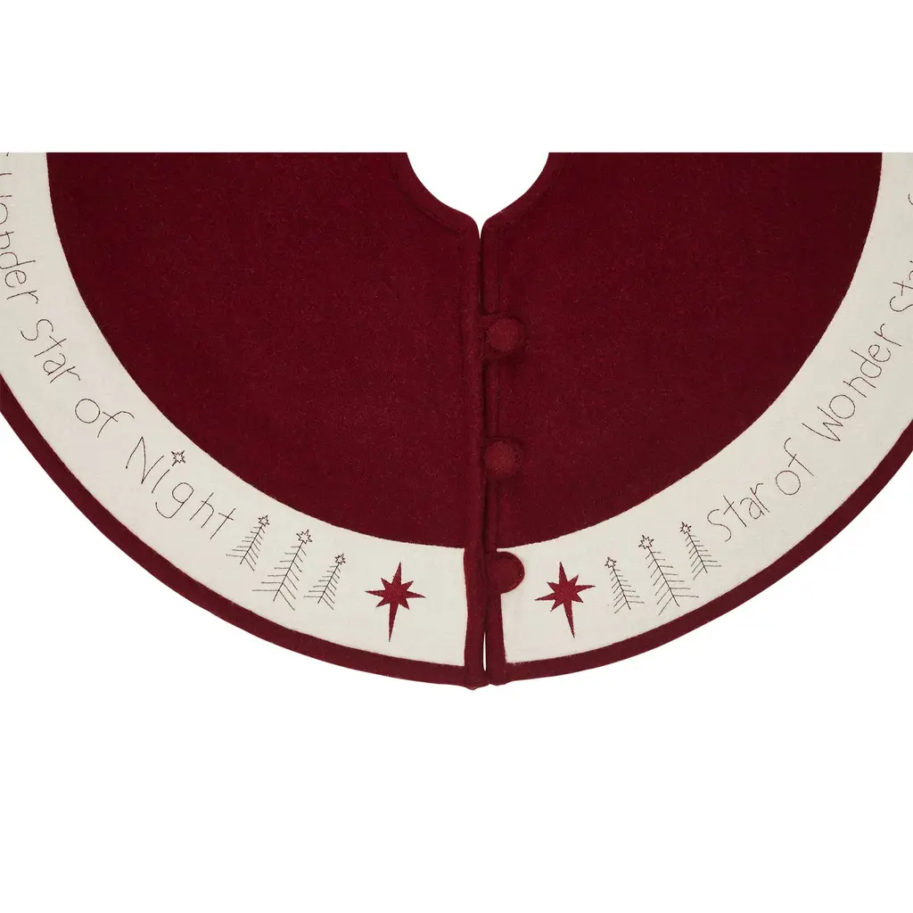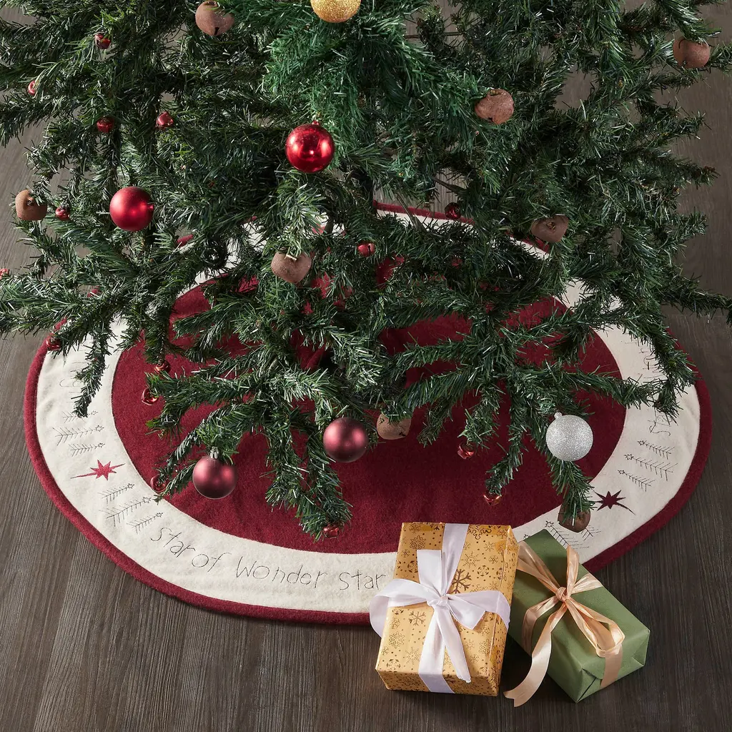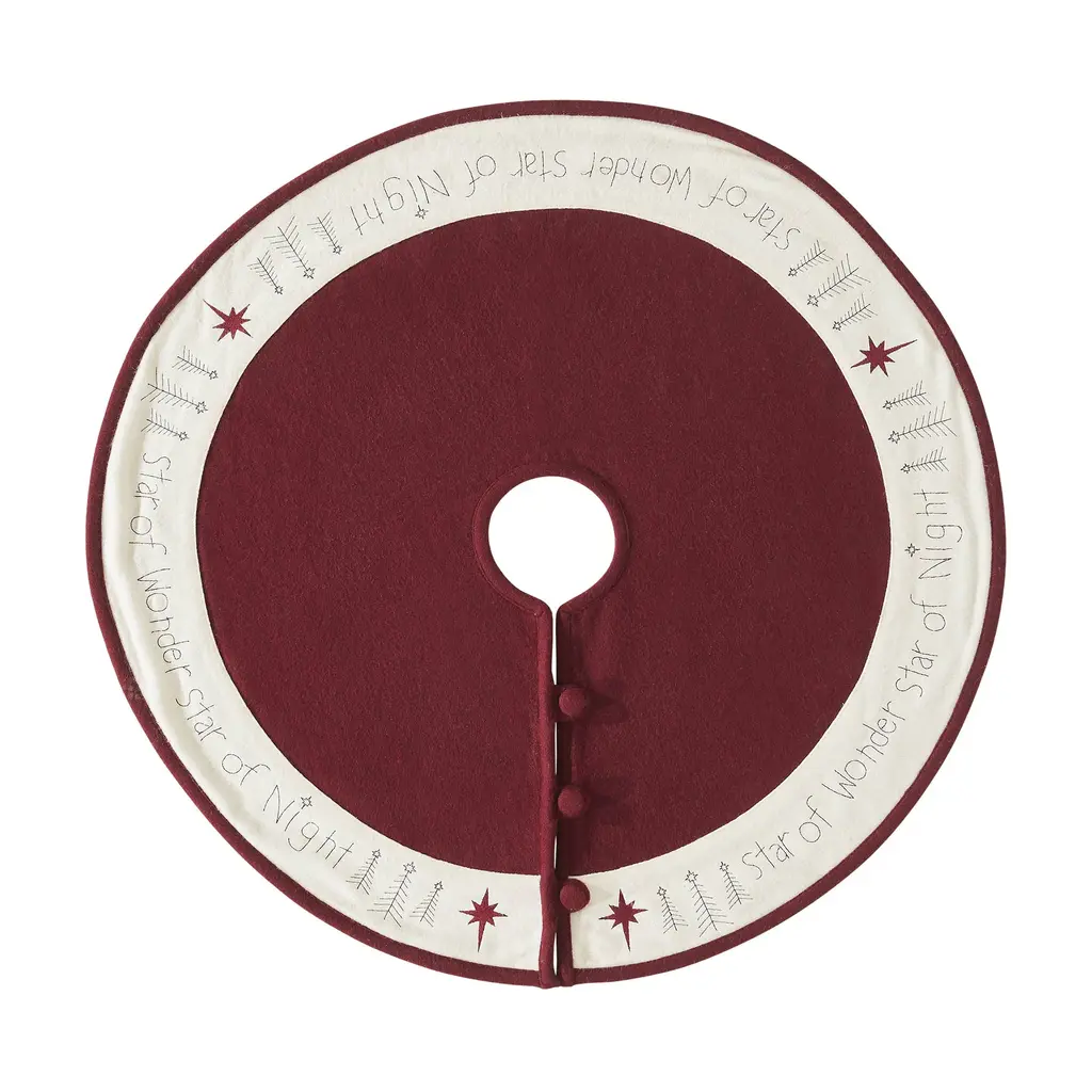Create warm Christmas memories around a traditional Christmas tree with this primitive style Christmas tree skirt. The round tree skirt features a 24 inch diameter. A warm burgundy base in felt will add simple, sophisticated style for a perfect country Christmas look. A wide, embroidered border adds a primitive touch to the design. The elegant Christmas tree skirt features embroidery within the cream border reading, Star of Wonder, Star of Night with star accents. Pair with matching stockings for a complete, festive holiday look.