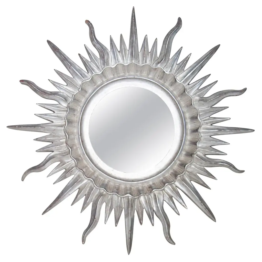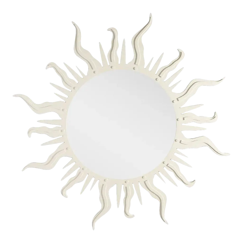 A round mirror framed in a starburst shaped frame. The Linen White finish on this frame is hand applied giving a clear medium gloss white finish. The Framed Mirror features a Gallery Quality Hand Finished Wooden Frame with a Distortion Free non-Beveled Mirror. This Framed Mirror arrives ready to hang with hanging hardware pre-installed.