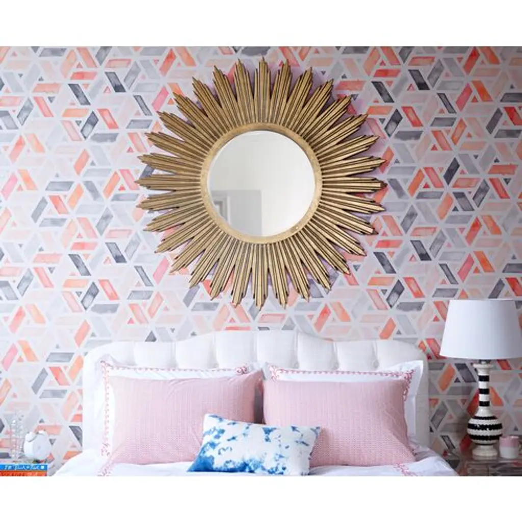 The sunburst mirror receives a Hollywood Regency-style makeover, thanks to the dramatic lines radiating from its center and shimmering aged gold finish.