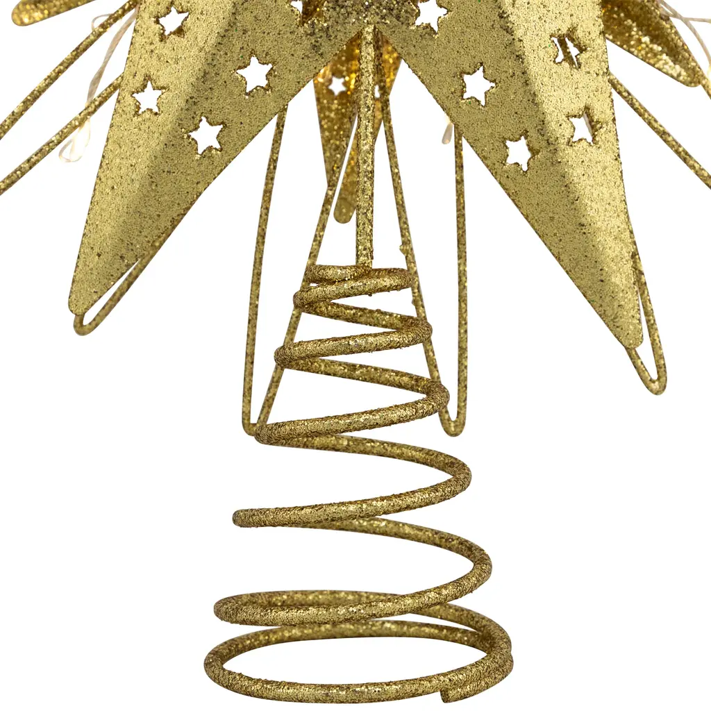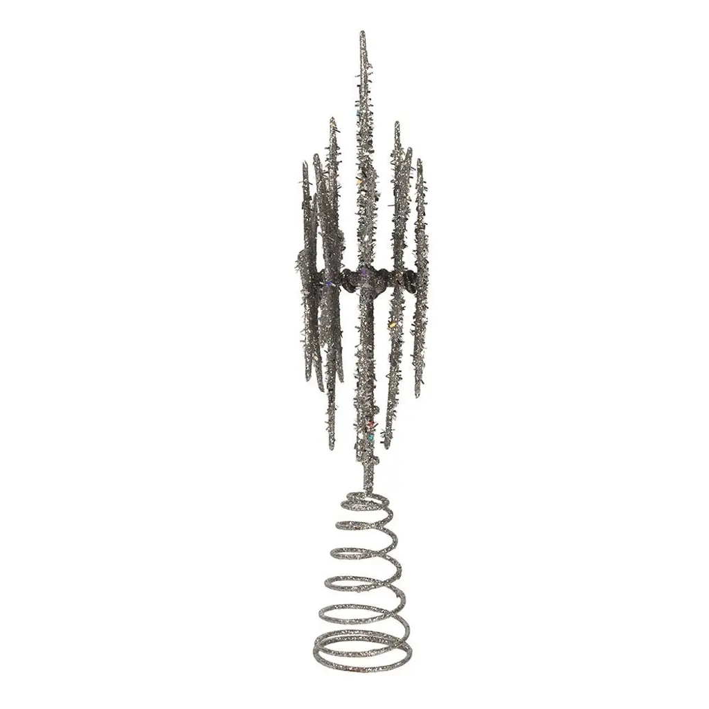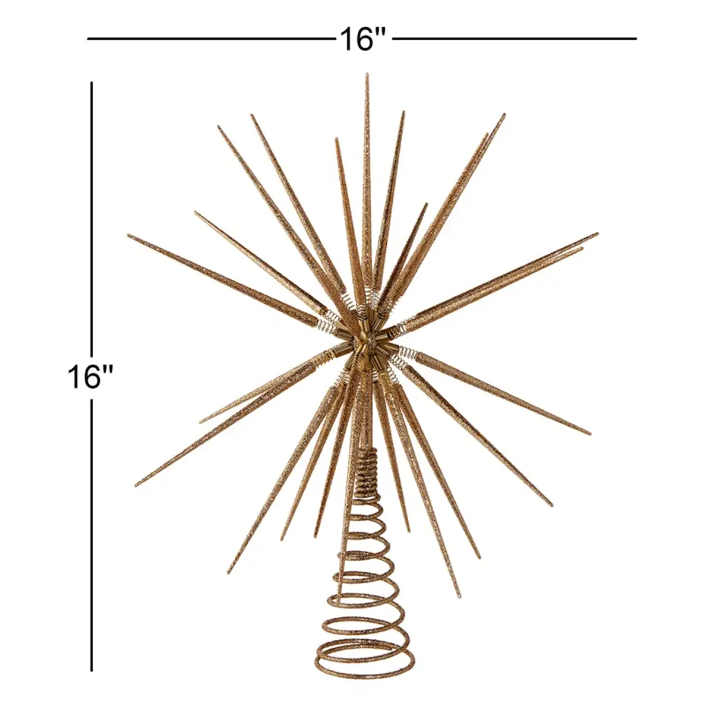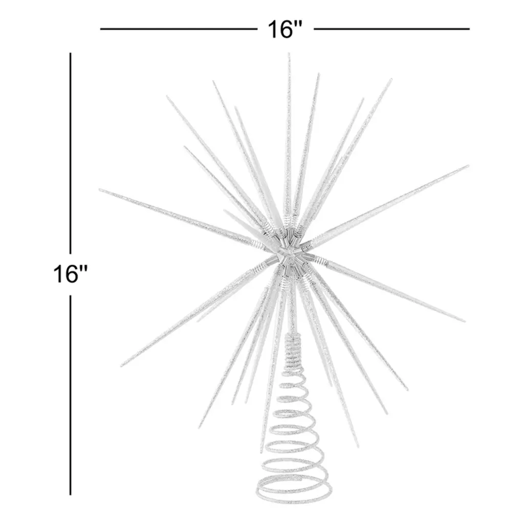 This festive tree topper adds the right finishing touch to your Christmas tree. It showcases an eye-catching starburst design with a shimmering hue for an elegant, modern look in your living room or family den. This tree topper is crafted from plastic, and it measures 16" tall, so it's sure to make a statement. Down below, a spiraling base provides a spot for it to pop on the tip-top of your tree. Plus, this chic tree topper is foldable for easy storage when it's not in use.
